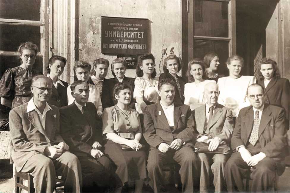 Ил. 2. Выпускники кафедры этнографии МГУ. Профессора (сидят, слева направо) С.А. Токарев, Е.М. Шиллинг, С.П. Толстов, М.О. Косвен, Н.Н. Чебоксаров среди студентов (стоят: Т.Трофимова, Л.В. Покровская, Л.Н. Чижикова). 1949 г.