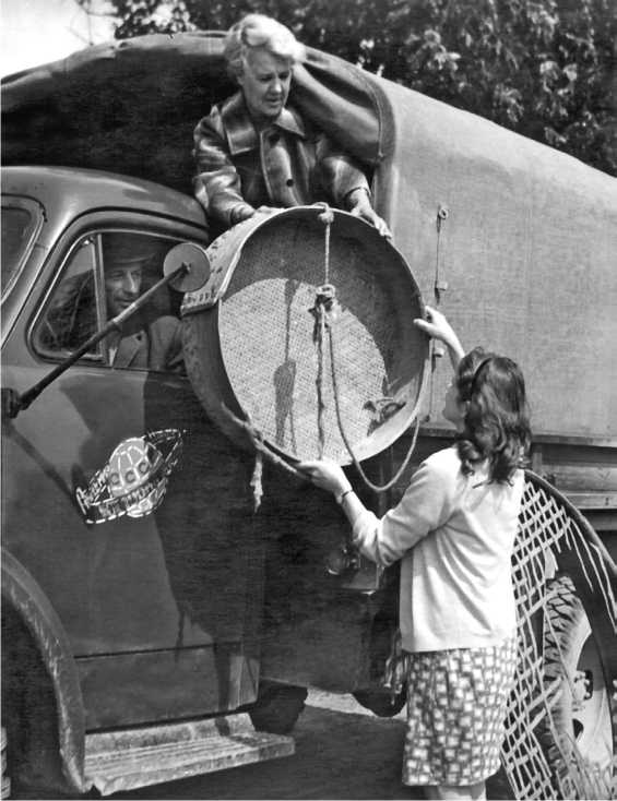 Ил. 7. Начальник Прибалтийской экспедиции Л.Н. Терентьева загружает в машину этнографические экспонаты. 1980-е гг.