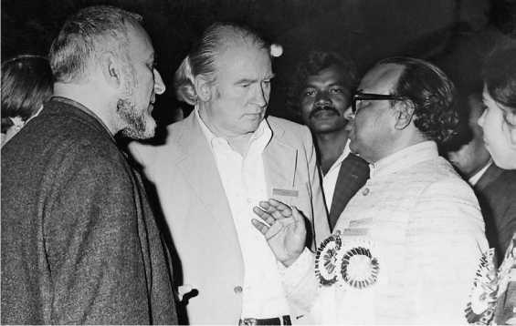 Ил. 15. С.А. Арутюнов и Ю.В. Бромлей беседуют с Президентом X Конгресса МКАЭН проф. Л.П. Видьярдхи в г. Дели, Индия. 1978 г.