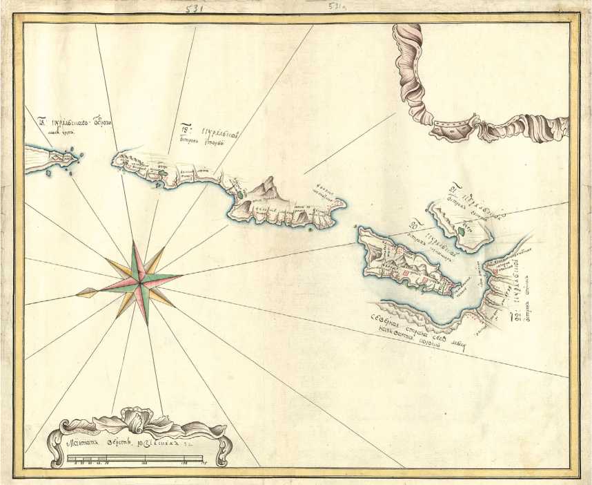 Ил. 3. Карта айнских поселений и крепостей на южных Курильских островах и северо-востоке Хоккайдо (фрагмент). Источник: РГАДА (Ф. 7. Оп. 2. Д. 2539. Л. 531)