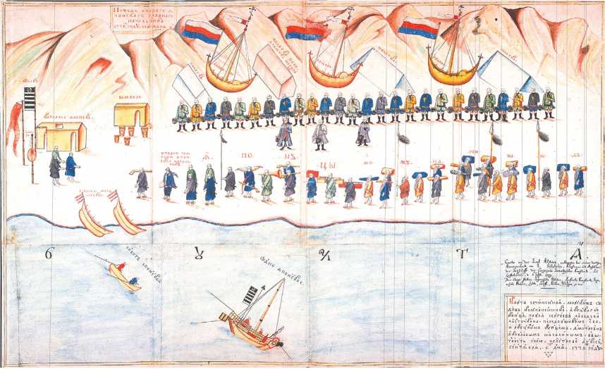 Дневники и письма участников самых первых японских экспедиций на острова Кунашир и Итуруп в конце XVIII в. предоставили ценные сведения о процессе фиксации айнских топонимов в японских текстах и картах. В том числе мы смогли выяснить, что некоторые топонимы, хотя и происходят из айнского языка, были зафиксированы отчасти ошибочно, поскольку являлись ситуативными описаниями некоторых особенностей ландшафта [17]. Роль айнов как проводников не ограничивалась картографической деятельностью русских и японцев. В ряде случаев айны выступали проводниками в связи с конкретными запросами русских и японцев о необходимости посещения японских и российских поселений соответственно. Так, именно айны Итурупа впервые привели русских на Хоккайдо в местную японскую факторию для переговоров о торговле в 1778 г. [15]. В этом смысле весьма показателен рисунок встречи российской экспедиции японскими чиновниками на северо-востоке Хоккайдо, выполненный одним из её участников Д.Я. Шабалиным: айны («мохнатый народ») изображены на нём наравне с японцами и русскими (ил. 4). Таким же образом айны того же Итурупа в 1803 г. сопроводили отряд японских чиновников на о. Уруп в основанное там незадолго до того российское поселение [18].