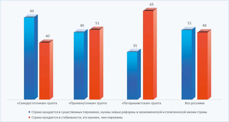 Рис. 4. Распределение сторонников перемен и приверженцев стабильности среди представителей «самодостаточной», «патерналистской» и «промежуточной» групп, по данным Института социологии ФНИСЦ РАН, 2018 г., %