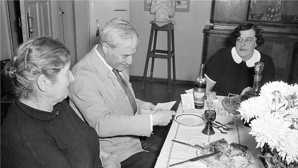 Ил. 6. Б. Пастернак читает телеграмму о присуждении ему Нобелевской премии. Слева Нина Табидзе, справа Зинаида Пастернак. Переделкино, 23 октября 1958. Ист.: https://pastvu.com/p/863888