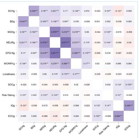 Признаки | SCHg | MDDg | NEURg | EPQ Ng | WORRYg | Risk-taking | SOCg | IQg | EDUg |