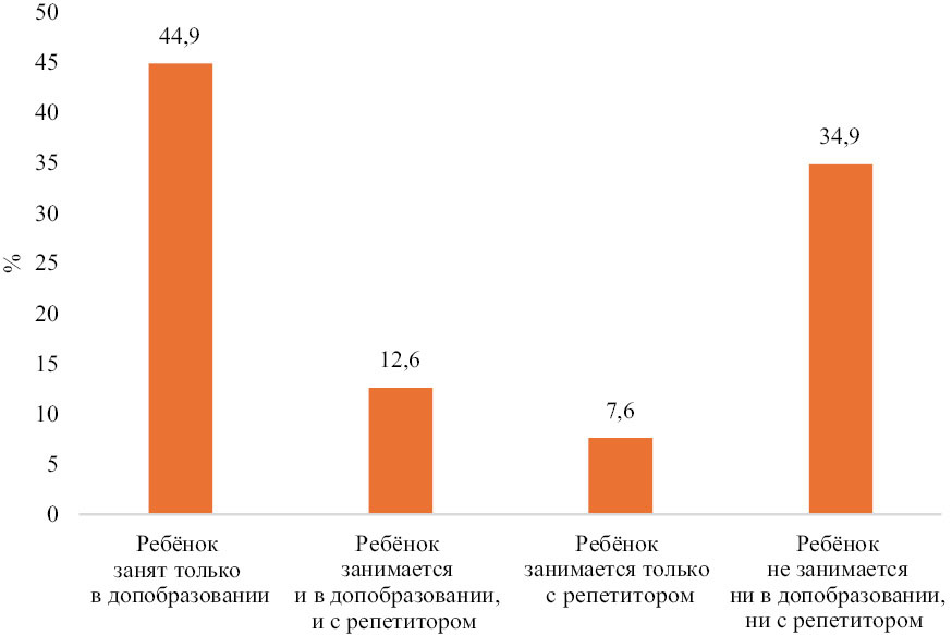 Из приведённых данных видно, что доля родителей, чьи дети не получают дополнительных образовательных услуг, составляет около трети (34.9%). В целом с репетитором занимается каждый пятый (20.2%). Только в системе дополнительного образования занимается чуть меньше половины (44.9%).