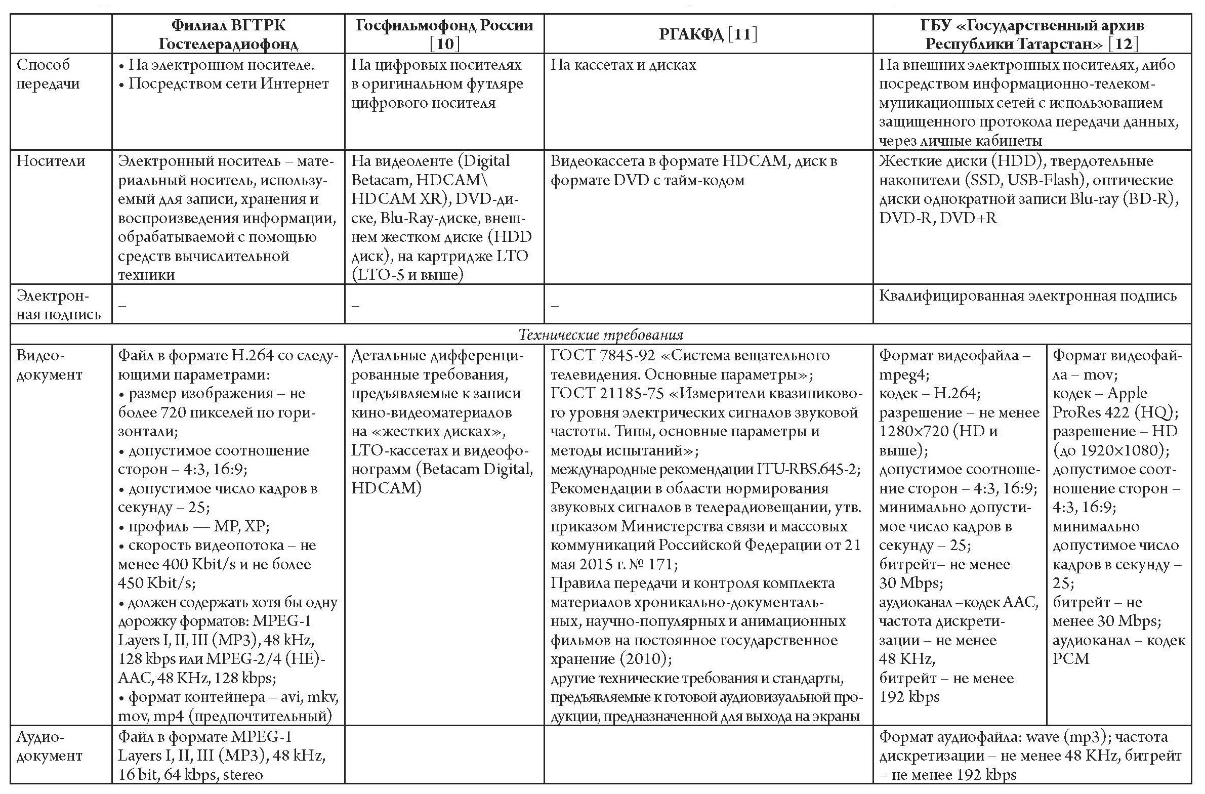 В таблице 3 представлено сопоставление некоторых требований, предъявляемых к обязательным экземплярам аудиовизуальной продукции, передаваемой ее производителями в Гостелерадиофонд, Госфильмофонд России, федеральное казенное учреждение «Российский государственный архив кинофотодокументов» (далее – РГАКФД) и в ГБУ «Государственный архив Республики Татарстан». На основании приведенных данных можно отметить, что ни в РГАКФД, ни в Госфильмофонде России не применяется доставка обязательных экземпляров аудиовизуальной продукции посредством сети Интернет. При этом согласно пункту 3.4.1 Порядка сдачи-приемки фильмов на государственное хранение в Госфильмофонд России, утвержденного приказом генерального директора Госфильмофонда России от 18 сентября 2023 года № 215, фильмы на кинопленке принимаются на постоянное государственное хранение, а согласно пункту 3.4.2 фильмы на цифровых носителях информации принимаются на временное хранение на срок, регламентированный гарантийными обязательствами производителей цифровых носителей информации в части сохранности информации [10].
