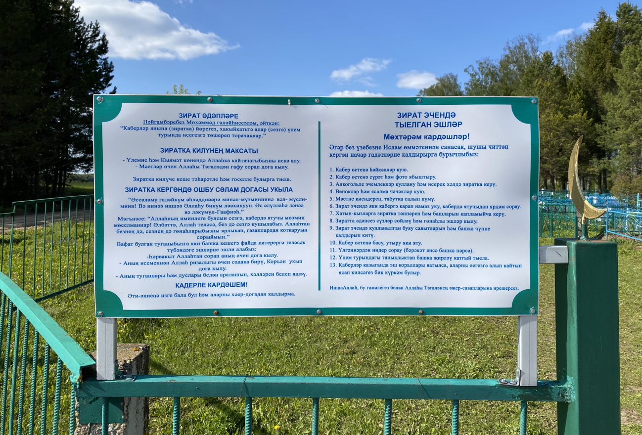 Рис. 1. «Правила поведения», установленные на ограде татарского кладбища с. Боль-шие Метески Тюлячинского района Республики Татарстан. 15 мая 2024 г. Фото А.М. Ахунова.