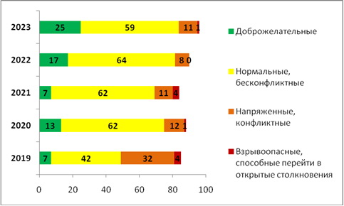 В 2019 г. более благоприятные оценки наблюдались в сельских населенных пунктах. В городах межэтнические отношения характеризовались сдержанно. Особенно тревожной на этом фоне в этот период выглядела ситуация в г. Якутске, где около трети опрошенных отмечали напряженность, а 4% даже взрывоопасность. В 2020 г. среди столичных жителей и сельчан очевиден рост позитивных оценок в сравнении с предыдущим годом. И эта положительная динамика продолжает наблюдаться в ответах жителей Якутска и в 2023 г., а у сельских жителей они стабильно держатся на уровне 2019 г. Примечательно, что в 2022 г., на фоне начавшейся СВО, жители оценивали доброжелательность межнациональных отношений в своем населенном пункте (независимо от его величины) в равной мере – на уровне 17%. В 2023 г. анализ ответов жителей разных по величине населённых пунктов свидетельствует о повышении доли доброжелательных характеристик межнациональных отношений на местах в Якутске и других городах республики до 25 и 29% соответственно.