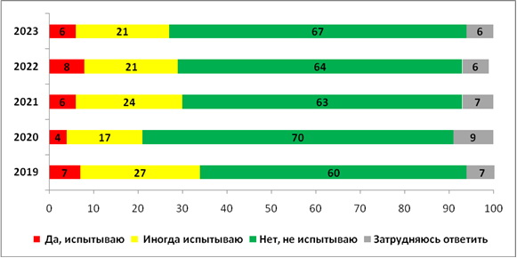Вы лично испытываете раздражение или неприязнь по отношению к представителям каких-то национальностей? | 2019 | 2020 | 2021 | 2022 | 2023 | ||||||||||||