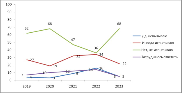 В 2019–2023 гг. не более 4–8% респондентов часто чувствовали неприязнь к представителям каких-либо национальностей, иногда – 17–27%. Людей, не испытывающих раздражения к людям других национальностей, большинство – 60–70%. В последние годы такое соотношение стабильно. Если обратиться к данным мониторингов ФНИСЦ РАН, то мы увидим, что республиканские данные согласуются с ними. По результатам общероссийского опроса 2020 г. уверенное большинство респондентов (68%) придерживается устойчивых позитивных установок. Такое распределение мнений жителей республики может быть обусловлено как продолжительным взаимодействием, которое стало восприниматься как повседневная необходимость, а иногда и взаимный интерес, так и моделью поведения, демонстрируемой властными структурами. Таким образом, в пределах 10% – группа риска, а установки пятой части респондентов можно отнести к неустойчивым, и их ориентированность может меняться в зависимости от обстоятельств или внешних влияний.