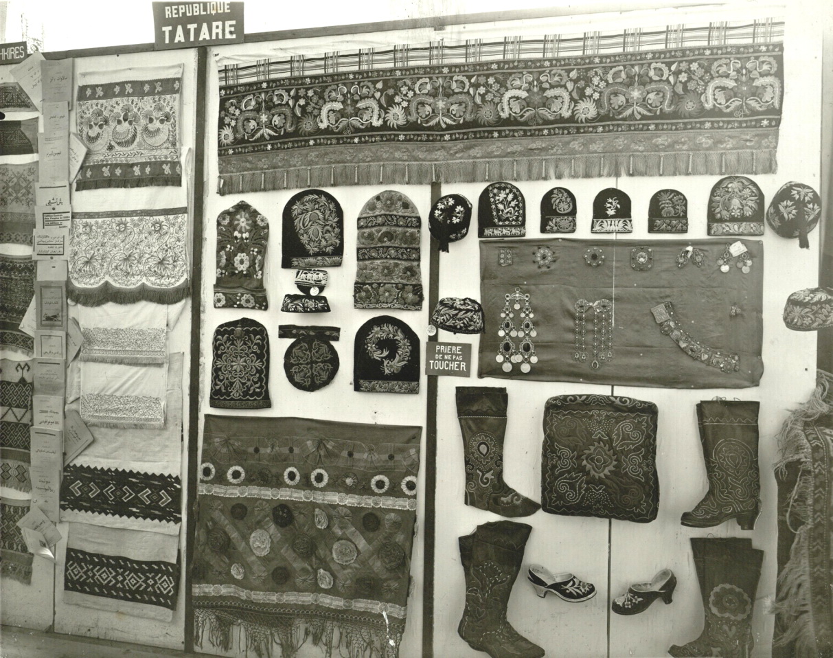 В 1925 г. Музей принял участие в реализации крупнейшего международного проекта – Международной выставки декоративного искусства и художественной промышленности в Париже. Н.И. Воробьев вместе с П.М. Дульским организовали в Казани сбор предметов татарского быта и этнографии (всего 134 ед.) для раздела Татреспублики в павильоне СССР (Рис. 1). Согласно идейному замыслу, на выставке к экспонированию предлагались артефакты декоративного искусства, архитектуры и дизайна стран мира. Проект Отдела Татреспублики был разработан архитекторами Н.А. Ладовским и М.Я. Гинзбургом. Одним из организаторов павильона советского декоративного искусства стал командированный в Париж Татнаркомпросом заведующий художественным отделом ЦМ ТССР П.М. Дульский. Выставка работала с апреля по октябрь 1925 г. Предметы татарского декоративно-прикладного искусства после закрытия выставки переданы в собрание ЦМ ТССР (сегодня хранятся под коллекционным номером НМРТ КП–10301). Среди них – вышитые золотом головные уборы и полотенца, украшенные аппликацией покрывала, вышитые молитвенные коврики, образцы ткачества, кожаная обувь, украшения: браслеты, кольца, ожерелья.