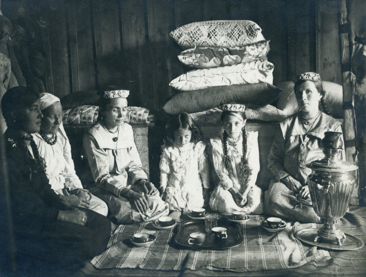 Женский татарский костюм того периода запечатлен на фотографии с молодыми женщинами и девочками села Большая Атня за чаепитием (Рис. 2). Сельчанки в ситцевых платьях городского фасона разместились на полу, расстелив пестрядинную скатерть в крупную клетку с самоваром и набором фарфоровых чашек с блюдцами. На заднем плане – нары с покрывалом и стопкой из перьевых подушек в цветных ситцевых и кружевных наволочках. Примечательны головные уборы женщин и девочек – калфаки-наколки с вышивкой жемчугом, и украшения – броши и низаные бусы (НМРТ КППи–117427/3).