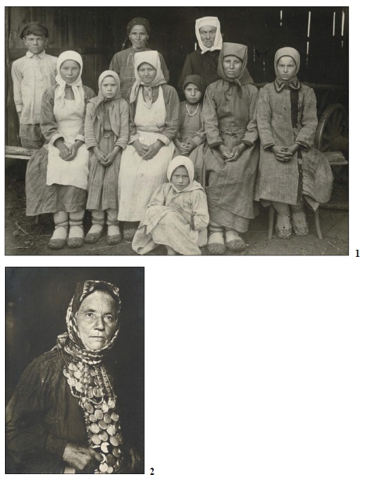 Заинтересовала исследователей деревня Нижнее Бишево, где проживали и татары, и кряшены. Здесь этнографами была сфотографирована группа кряшен – женщин и детей в повседневной одежде (Рис. 5, 1). Женщины одеты в ситцевые платья, фартуки и платки, обуты в лапти. Примечательно, что у трех женщин в центре платки повязаны высоко, поверх волосника головной убор меленчек с твердым прямоугольным налобником (НМ РТ КППи–116114). На другом снимке изображена кряшенка в праздничной одежде (Рис. 5, 2). На ней платье из пестряди, на голове фабричный жаккардовый платок, дополняют костюм шейное украшение – тамакса, и нагрудное – девет (НМ РТ КППи–116112).