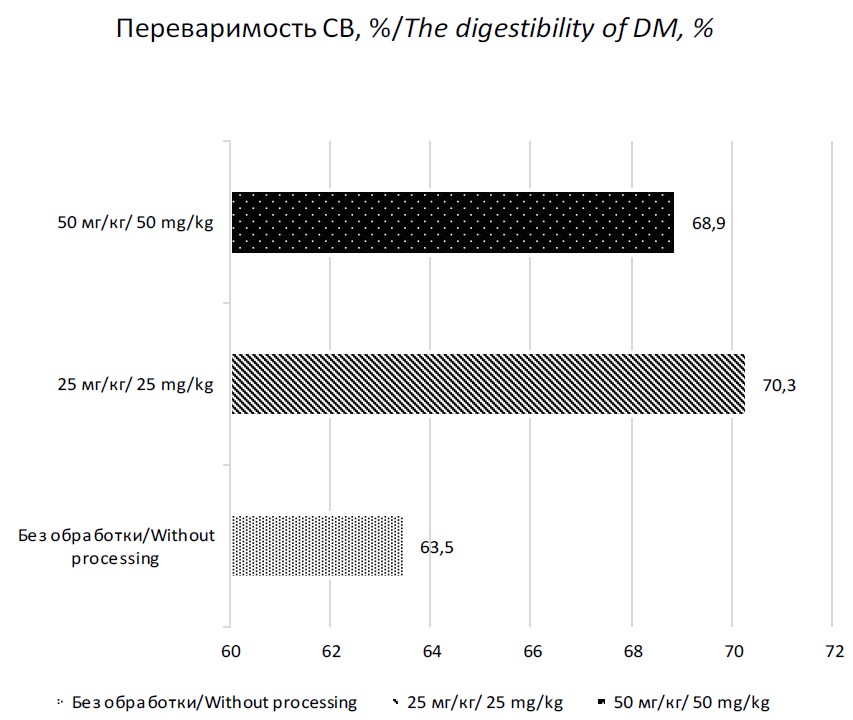 Изучение переваримости СВ ячменя после ферментации показало, что без обработки кормовой субстрат после 48-часовой инкубации способствовал переваримости сухого вещества на 63,5 %. Обработка ферментом амилоризином увеличивала переваримость СВ ячменя на 6,8 % при использовании фермента в концентрации 25 мг/кг и на 5,4 % – при использовании в концентрации 50 мг/кг (рис. 2).
