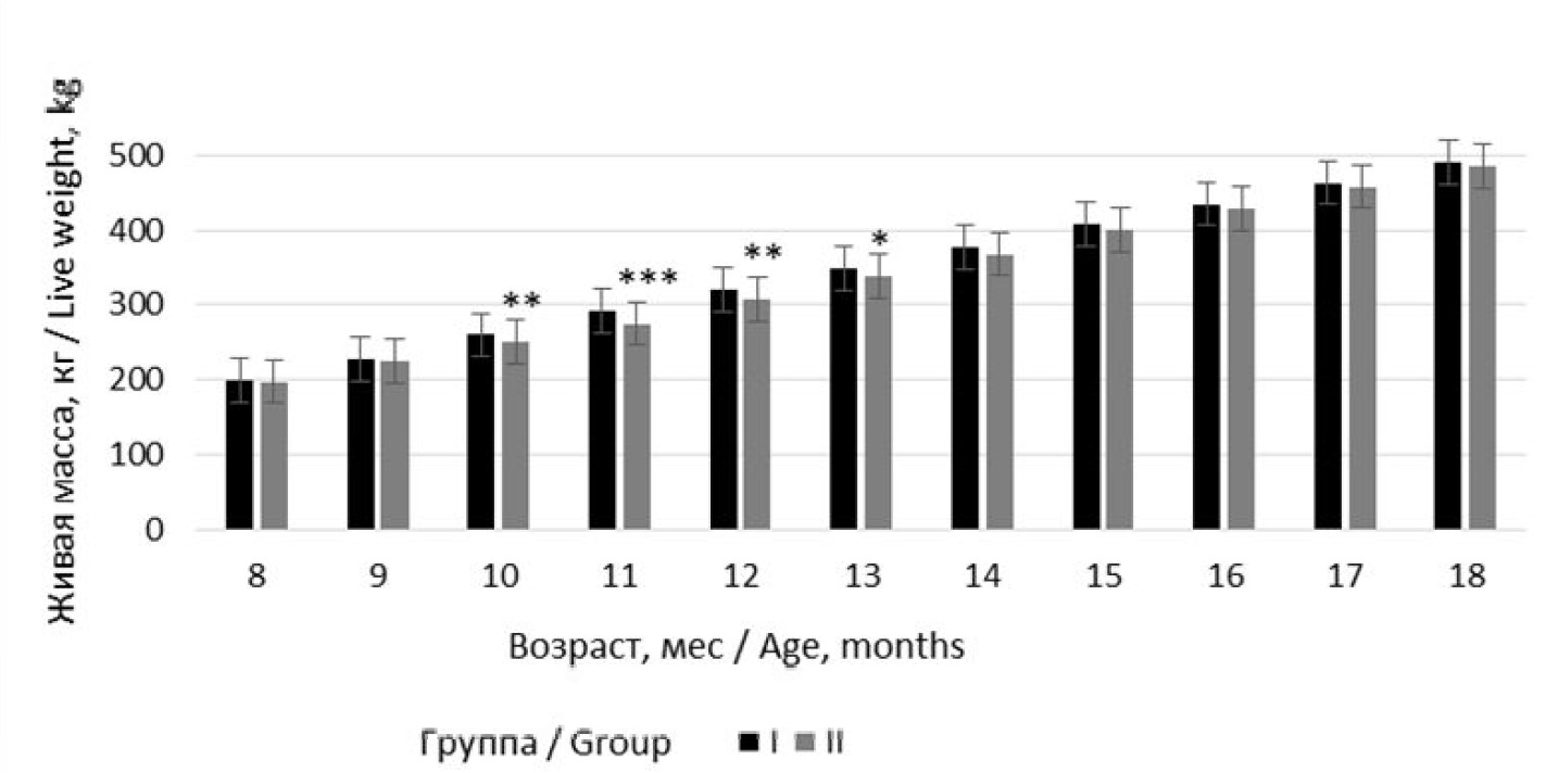 Одним из главных показателей роста и развития молодняка является его живая масса, на неё влияют различные факторы, такие как порода, пол, возраст, уровень кормления, технология содержания. В связи с этим нами проведена оценка влияния различных способов доращивания бычков в условиях сухостепной зоны Южного Урала на динамику живой массы, которая показала на имеющиеся межгрупповые различия в возрасте с 10- до 13-месячного возраста (рис. 1).