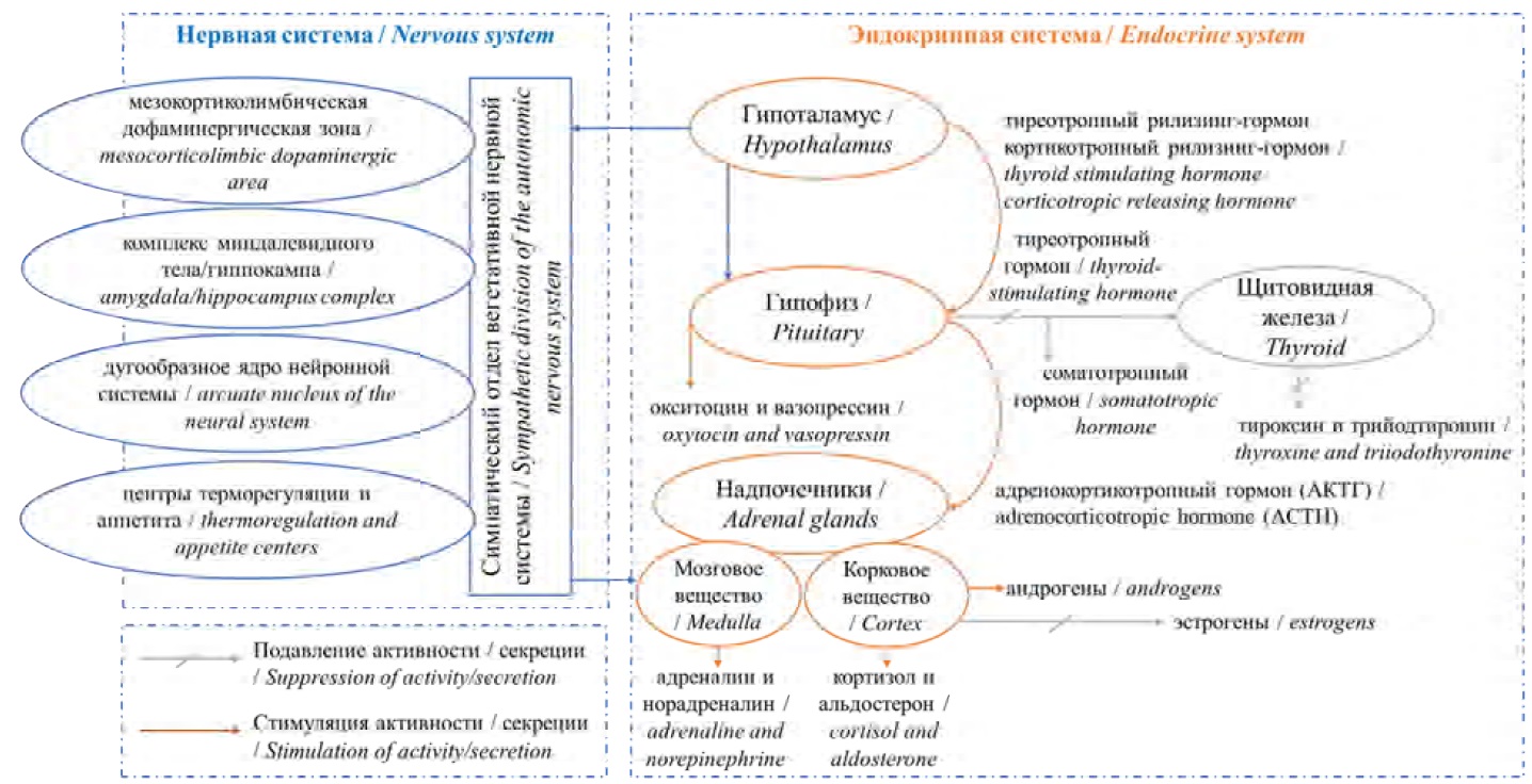 Биохимия и физиология стресса. Стресс как состояние, индуцированное внешними или внутренними негативными факторами и угрожающее гомеостатическим параметрам организма, сопровождается сложным каскадом физиологических и поведенческих реакций, направленных на возвращение к обще-нормальному равновесию – эустазу (рис. 1). В реализации последних участвуют нейроэндокринная и иммунноклеточная системы, вкупе формирующие так называемый стресс-комплекс животного, основу которого слагают гипоталамо-гипофизарно-надпочечниковая ось и симпатический отдел вегетативной части ЦНС, тесно взаимодействующий с другими нервными центрами, а также тканями и органами на периферии (Tsigos C et al., 2020). Ключевыми метаболитами и эффекторами в этом случае выступают кортикотропин-рилизинг-гормон (КРГ), тиреотропин-рилизинг-гормон (КРГ), адренокортикотропин (АКТГ), окситоцин, вазопрессин, тироксин, глюкокортикоиды (кортизол), минералокортикоиды (альдостерон) и катехоламины (норадреналин и адреналин). Последние, в частности, влияют на основные иммунные функции, такие как презентация антигена, пролиферация и трафик лейкоцитов, секреция цитокинов и антител, а также функциональную активность Т-хелперов и Т-киллеров (Elenkov IJ and Chrousos GP, 2007).