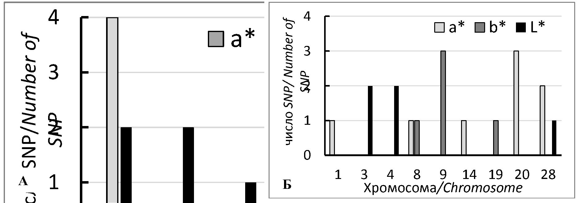 Риcунок 1. Распределение на хромосомах значимых SNP (P≤0,0001), ассоциированных с цветовыми характеристиками грудной (А) и бедренной (Б) мышц у кур F2 ресурсной популяции