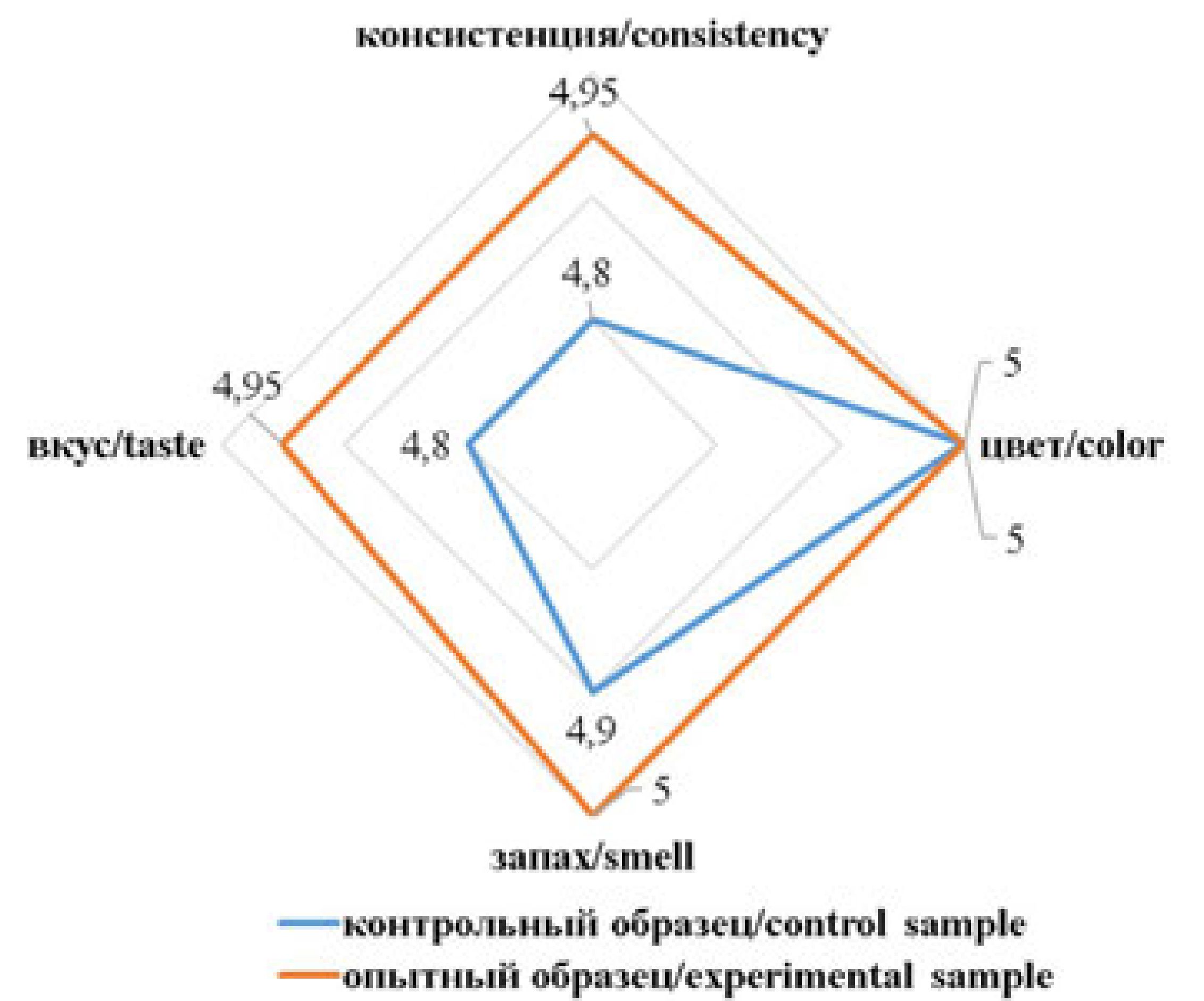 По основным показателям выработанные образцы продуктов соответствовали требованиям ТР ТС 033/2013 «О безопасности молока и молочной продукции» применительно к продукции для питания детей дошкольного и школьного возраста, согласно которому массовая доля жира в кисломолочных продуктах должна составлять 1,5-4,0 %; массовая доля белка – 2,0-5,0 %. В образцах исследуемых продуктов массовая доля жира находилась в пределах 3,9-4,0 %; массовая доля белка – 3,2-3,4 %. При этом следует отметить, что опытный образец превосходил контрольный по содержанию жира и белка соответственно на 0,1 и 0,2 %. Технологически обоснованным фактором при выработке образцов продуктов является установление наименьшего времени сквашивания опытного образца для достижения требуемой кислотности в пределах 25-30 мин, что очевидно связано с полноценностью состава белкового компонента. Содержание молочнокислых микроорганизмов в обоих образцах продукта составило не менее 1×107.