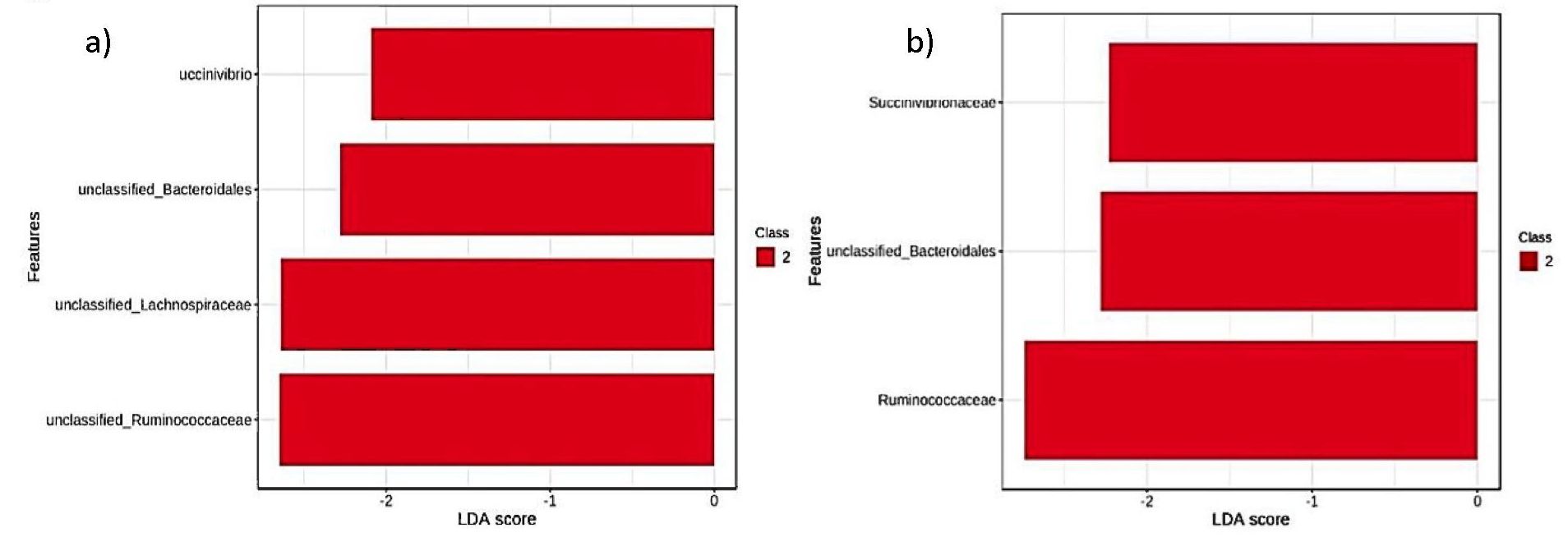 4. Рисунок 3. Линейный дискриминантный анализ (LDA) размера эффекта (LEfSe), размер эффекта был использован для расчёта таксонов, которые лучше всего различались между семействами (a) и родами (b) по группам m1 и m2
