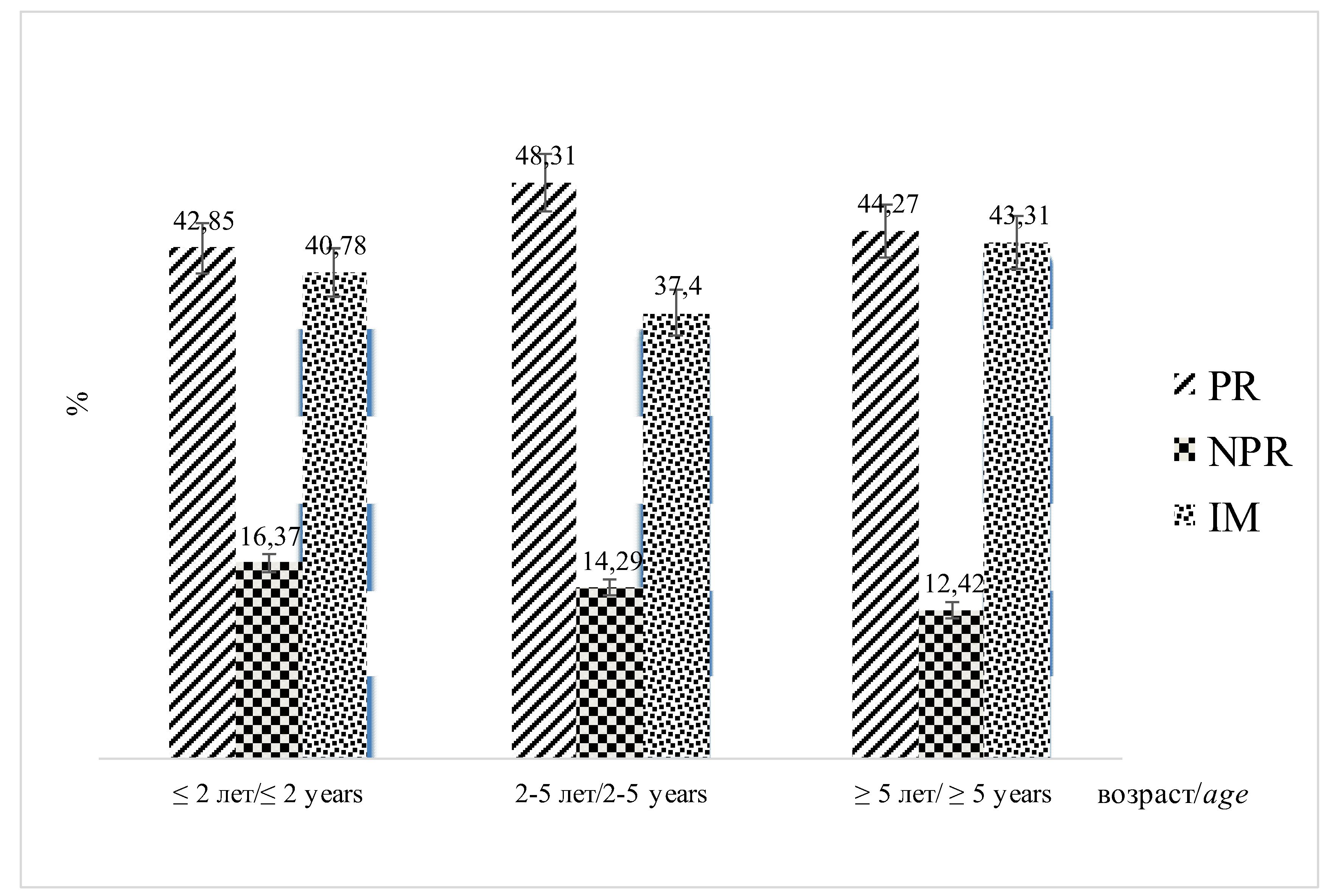 В I группе средний возраст быков-производителей был 21,8 месяца, во II группе – 48,9 месяца, а в III группе – 74 месяца. Результаты многомерного дисперсионного анализа свидетельствуют о статистически значимом влиянии возраста быков-производителей на содержание прогрессивно подвижных сперматозоидов в заморожено-оттаянном семени (F=4,25, P≤0,05). В заморожено-оттаянном семени взрослых быков-производителей 48,31±1,13 % сперматозоидов имели прямолинейное поступательное движение, что на 12,74 % больше, чем у молодых животных, и на 9,12 % – у быков-производителей III группы. Различия между этими группами и между I и III группами не являются статистически значимыми (рис. 1). Достоверная разница между I и III группами установлена по содержанию сперматозоидов с колебательным и манежным движением. У молодых быков сперматозоидов с таким движением оказалось на 3,95 % больше, чем у быков старше 5 лет. В сравнительном аспекте наибольшее содержание неподвижных сперматозоидов наблюдалось в группе быков-производителей, возраст которых в среднем составил 74 месяца. Содержание неподвижных сперматозоидов в исследуемых образцах данной группы в среднем составило 43,31±1,72 %, что на 5,91 абсолютных процента больше, чем у быков-производителей II группы.