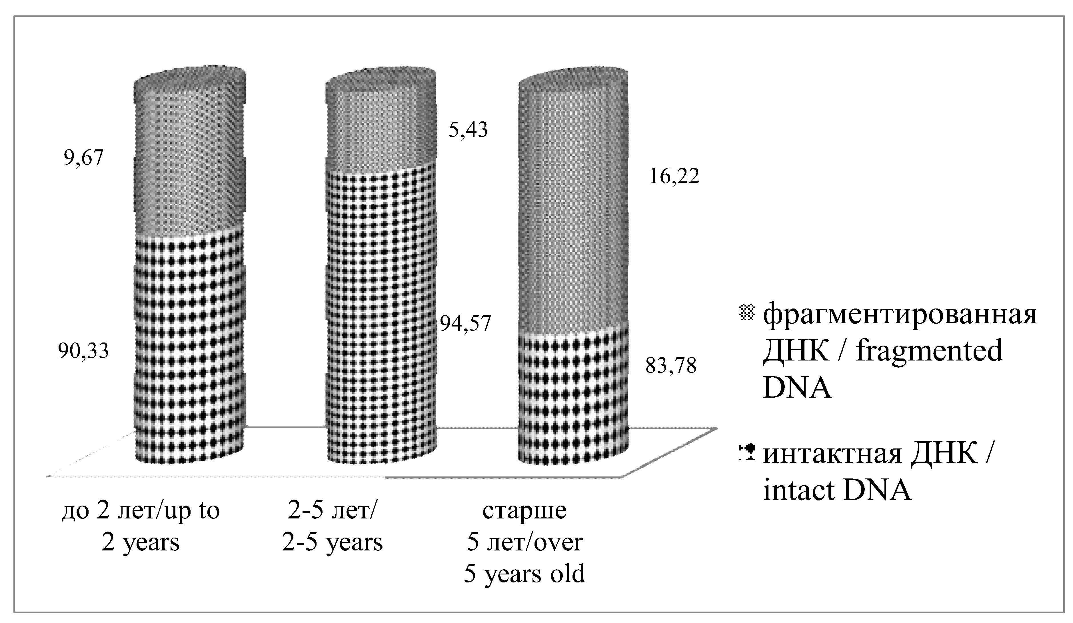 В исследуемых выборках уровень фрагментации яДНК в среднем составил 10,44 % с коэффициентом вариации 58,6 %. Максимальный уровень фрагментации яДНК (13,8 %) был обнаружен у быка-производителя в возрасте 16 месяцев, минимальный (1,8 %) – у быка в возрасте 49 месяцев. Результаты дисперсионного анализа опровергают нулевую гипотезу о взаимосвязи между возрастом быков-производителей и степенью фрагментации яДНК.