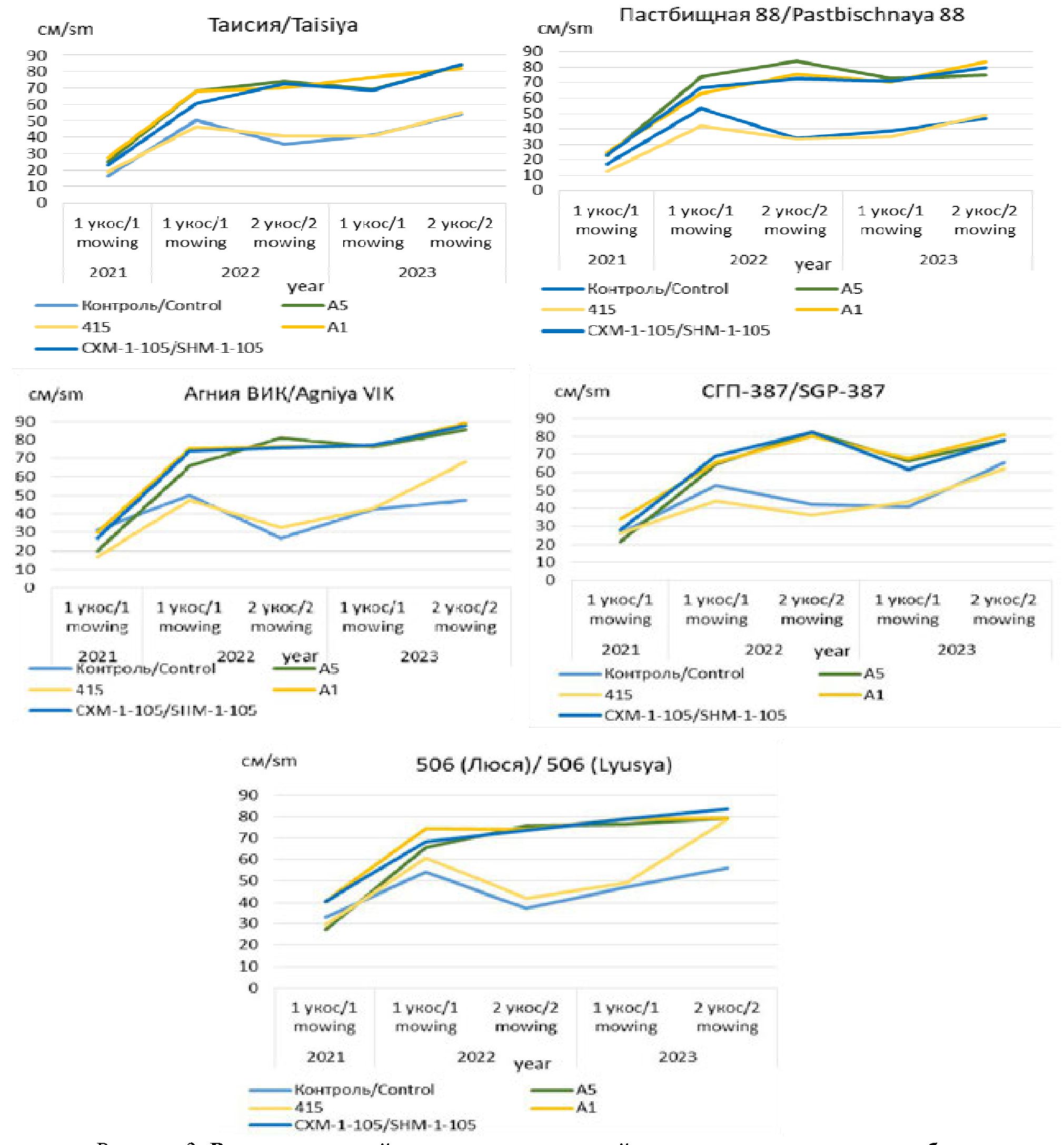 Figure 3. The height of alfalfa plants of various varieties and varietals in 2021-2023