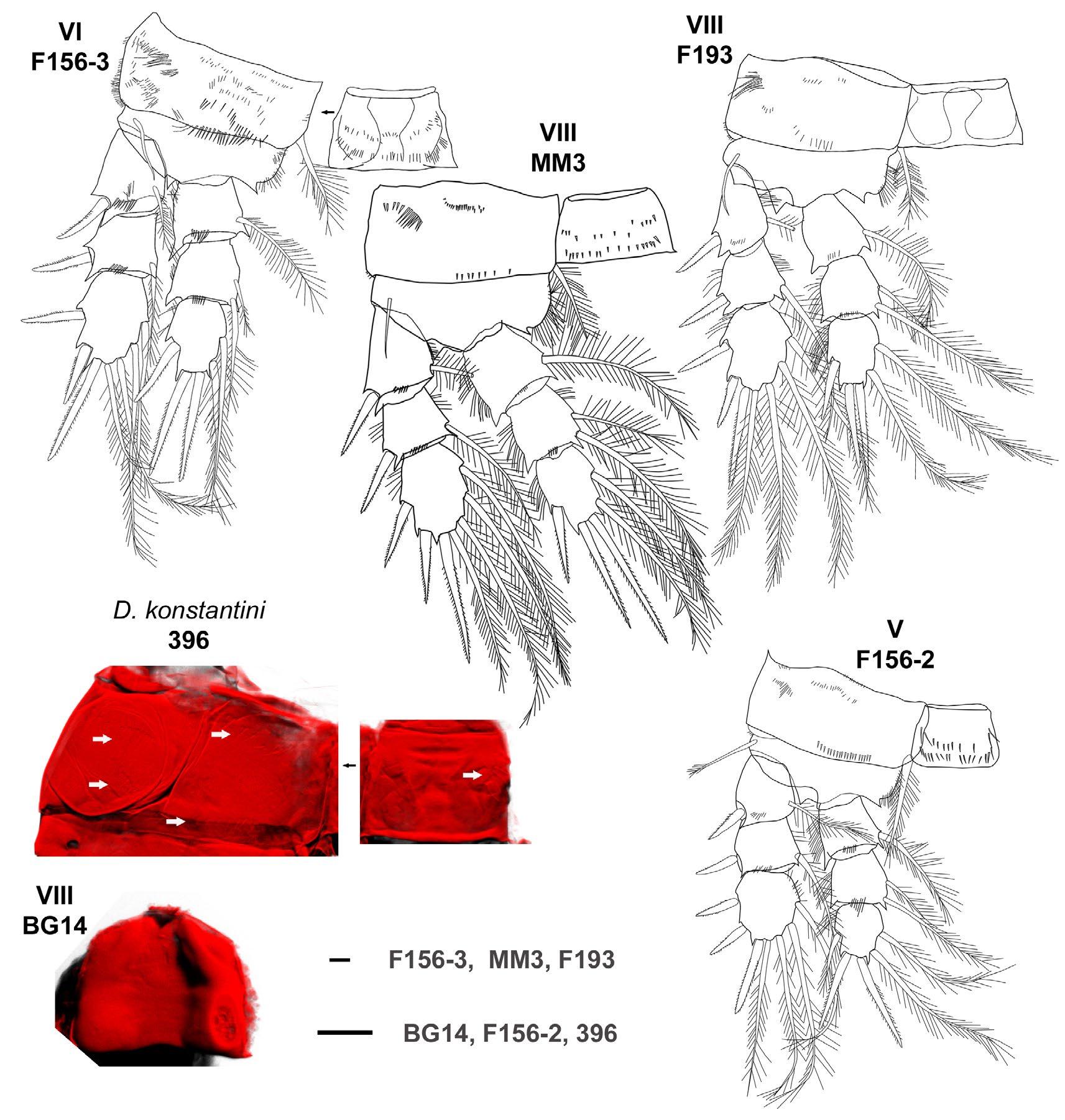 D. konstantini and F156-2 (V) are genetically closely related and differ from the versutus-group in the armature of Enp3P4. They have two spines and three setae. F156-2 P4 intercoxal sclerite with two rows of long spinules. The A2 basipodite of F156-2 is ornamented with two rows of spinules and a group of small spinules on the caudal surface, two rows of hair-like spinules on the proximal part of the frontal surface and hair-like spinules along both lateral margins armed with two naked setae and exopodal seta with short setules (Fig. 5, 6). Second endopodal segment armed with seven setae.