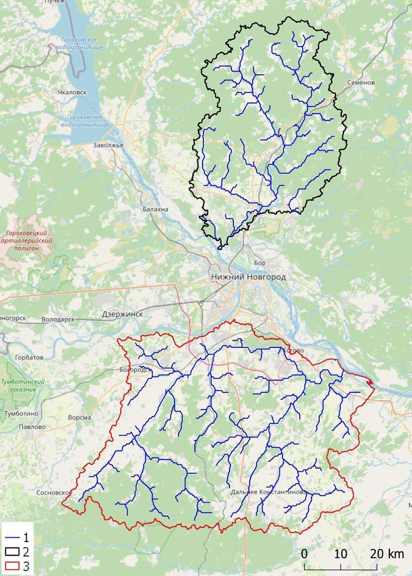 The Cheboksary reservoir is formed on the Volga River by the Cheboksary hydroelectric plant, located in the city of Novocheboksarsk. The length of the reservoir is 341 km, the area is 2190 km2, the total volume of water is 13.9 km3, the area of its own catchment basin without the upstream Volga basin is 131.9 thousand km2. The Linda (left tributary of the Volga, its length is 122 km, its catchment area is 1682 km2) and the Kudma (right tributary of the Volga, its length is 144 km, its catchment area is 3248 km2) catchments in the basin of the Cheboksary reservoir were selected as pilot sites reflecting the main patterns of biogenic element removal on the basis of expert assessment (Fig.1). The catchment basins are representative of the forested left bank and the agriculturally developed right bank of the Cheboksary reservoir. Moreover, karstic phenomena are widespread in the Kudma basin, which also influence the formation of runoff and the removal of nitrogen and phosphorus. There are gauging sections of state hydrological and hydrochemical monitoring of the Russian meteorological service in the selected rivers, which enables using these data for the calibration of mathematical models.