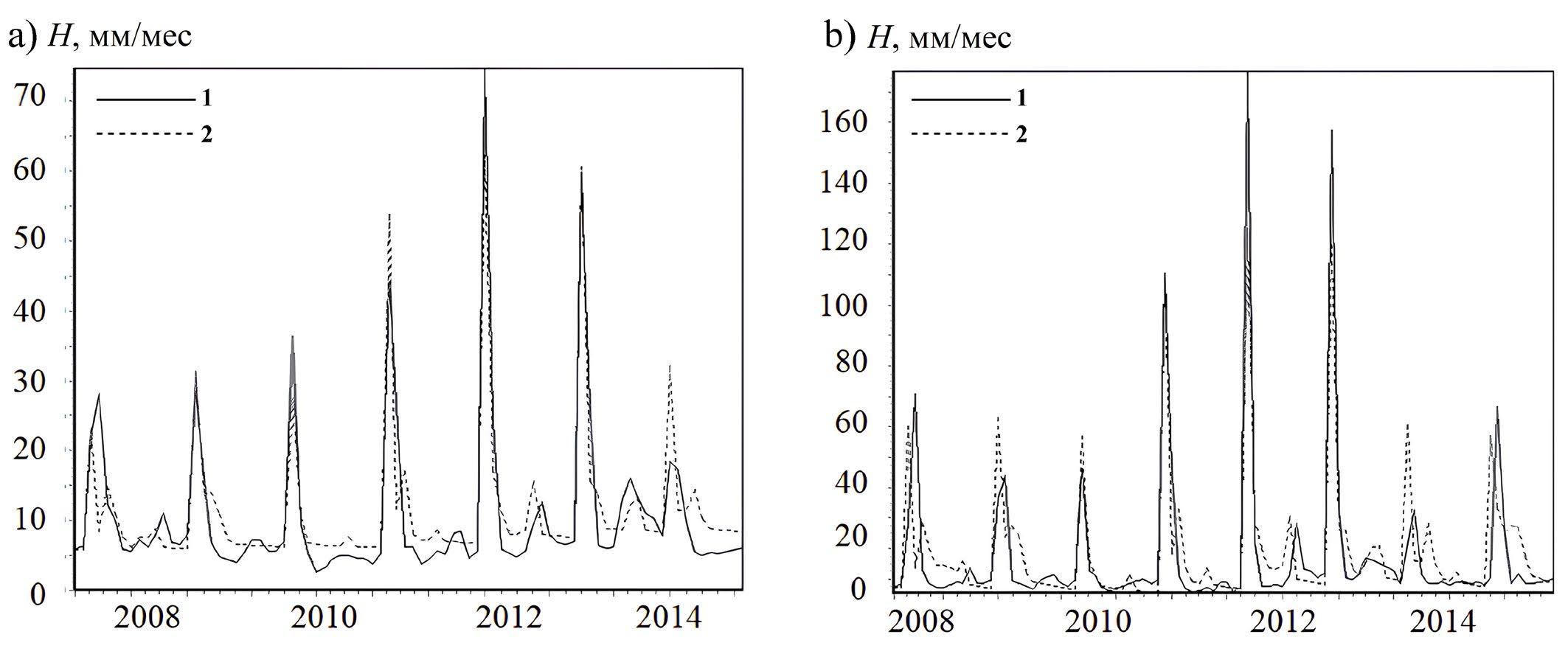 Fig.2. The observed (1) and calculated (2) average monthly runoff layers from the Kudma (a) and Linda (b) catchments.