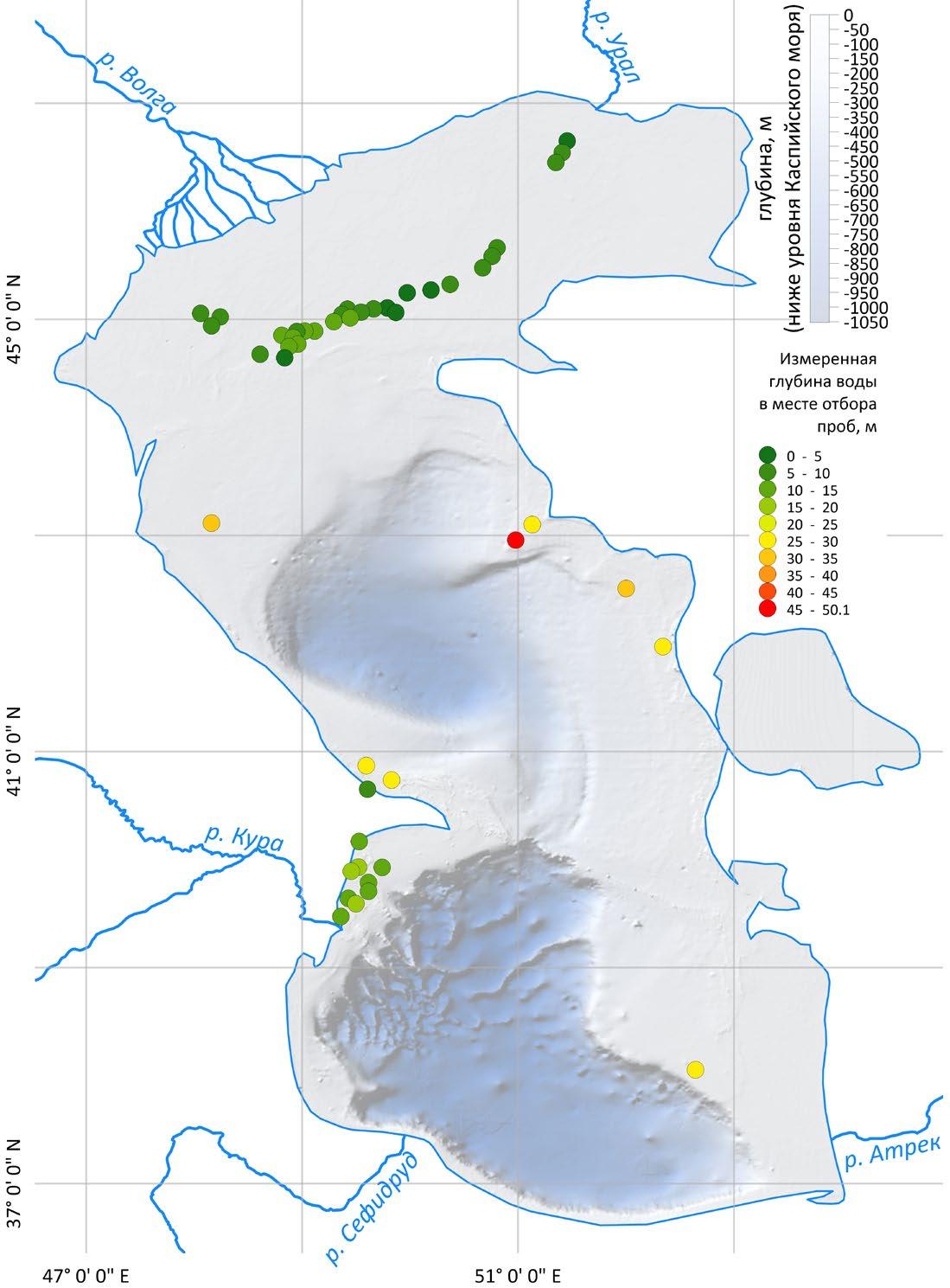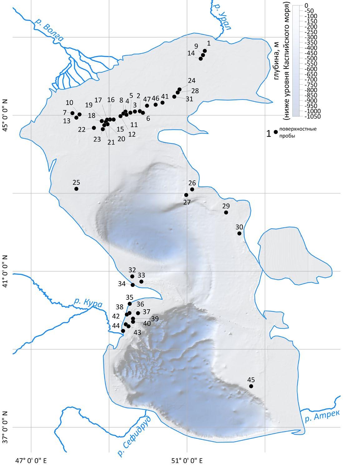 Согласно данным отчета (Гофман, 1966), всего изначально было отобрано 900 проб из 300 точек их отбора (по три пробы из каждой точки), однако в распоряжение автора коллекция попала в значительно сокращенном виде. За прошедшие с момента сбора коллекции Е.А. Гофман десятилетия часть проб была частично или целиком утеряна, поэтому за неимением достоверно установленной выборки количественный анализ в рамках данного исследования заменен качественным. Поскольку значимая часть акватории Каспийского моря мелководна (особенно Северный Каспий), фокус данного исследования направлен на изучение прибрежной территории, в которую включен анализ видового состава остракод из тех точек отбора проб, глубина моря в которых составляет менее 50 м. Для этого были отобраны пробы наилучшей сохранности – те, в которых сохранилось наибольшее число раковин остракод. Всего было изучено 45 прибрежных точек отбора проб (Рис. 1, 2).
