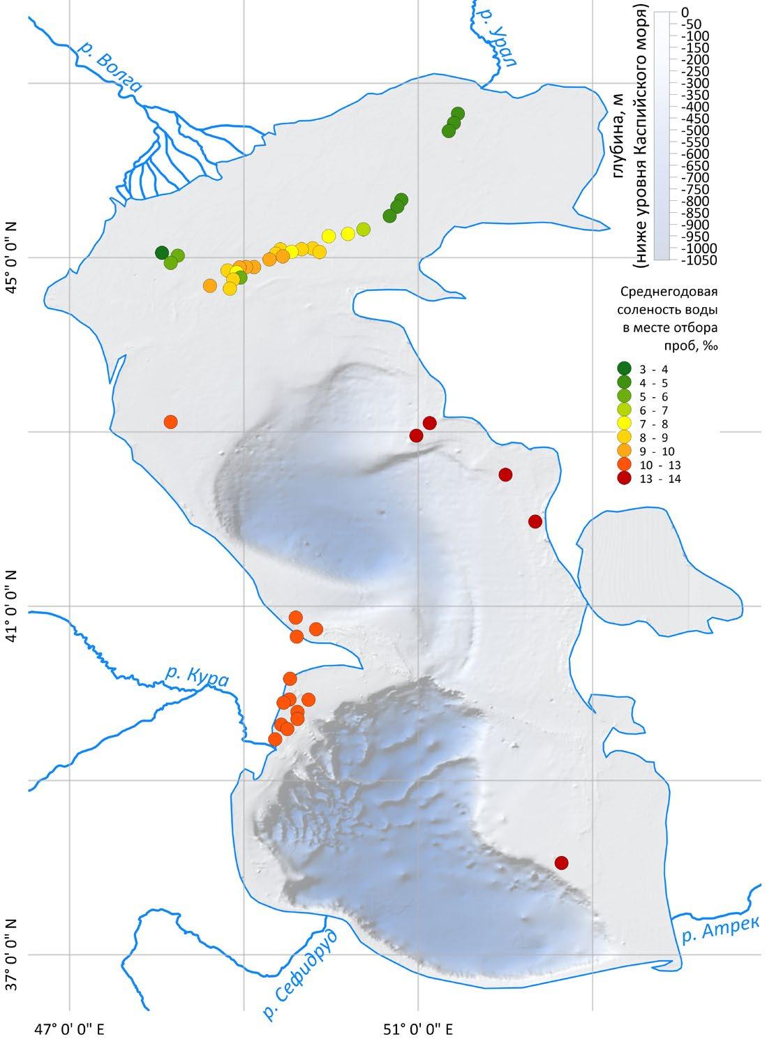 Рис.3. Среднегодовая соленость придонного слоя воды в точках отбора проб.