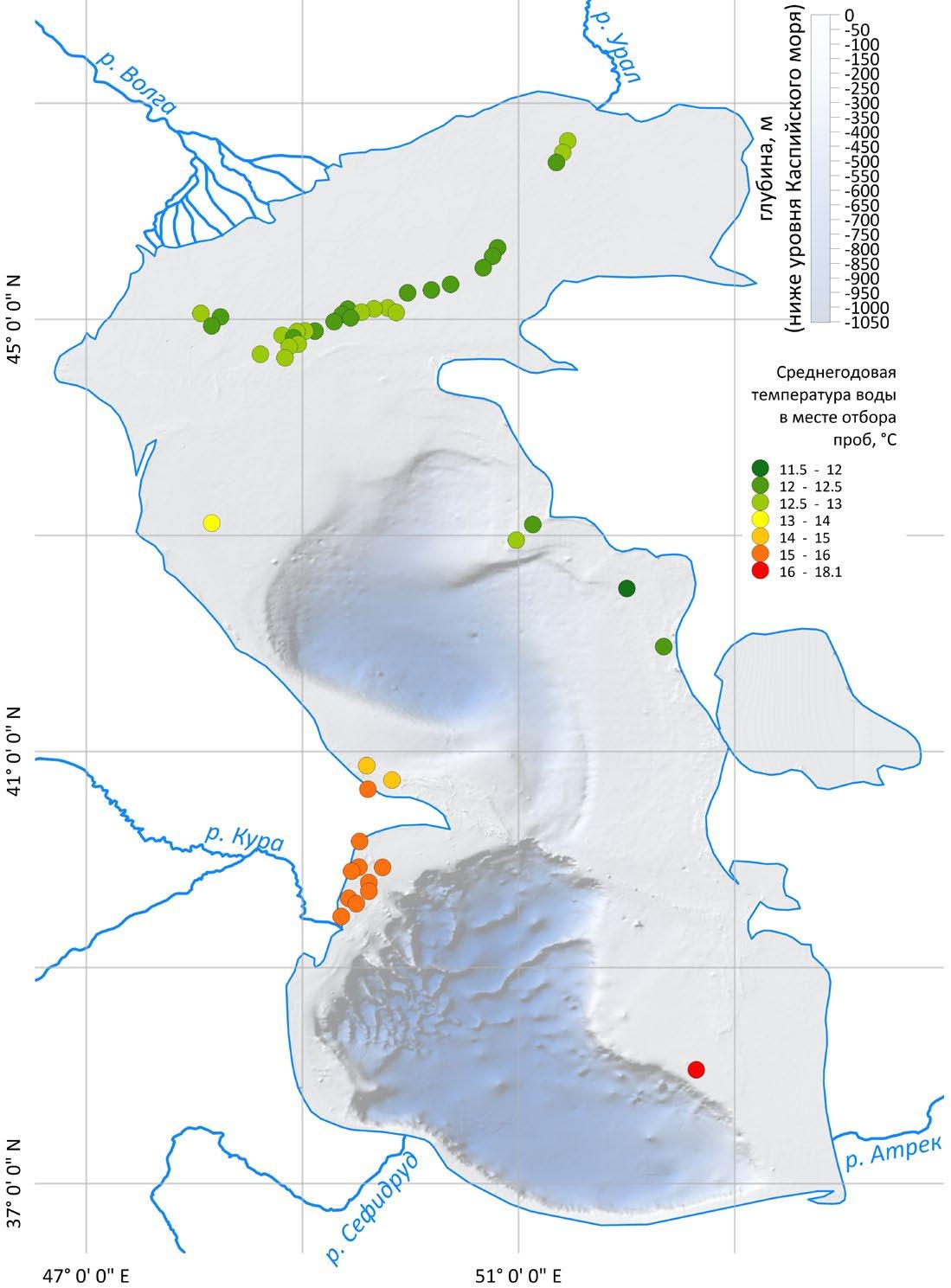 Для каждой точки отбора проб имеются среднегодовые показатели температуры и солености придонного слоя воды в момент отбора проб, а также данные о глубине моря. Для 45 точек, изученных в настоящем исследовании, эти сведения представлены на Рис. 2, 3, 4.