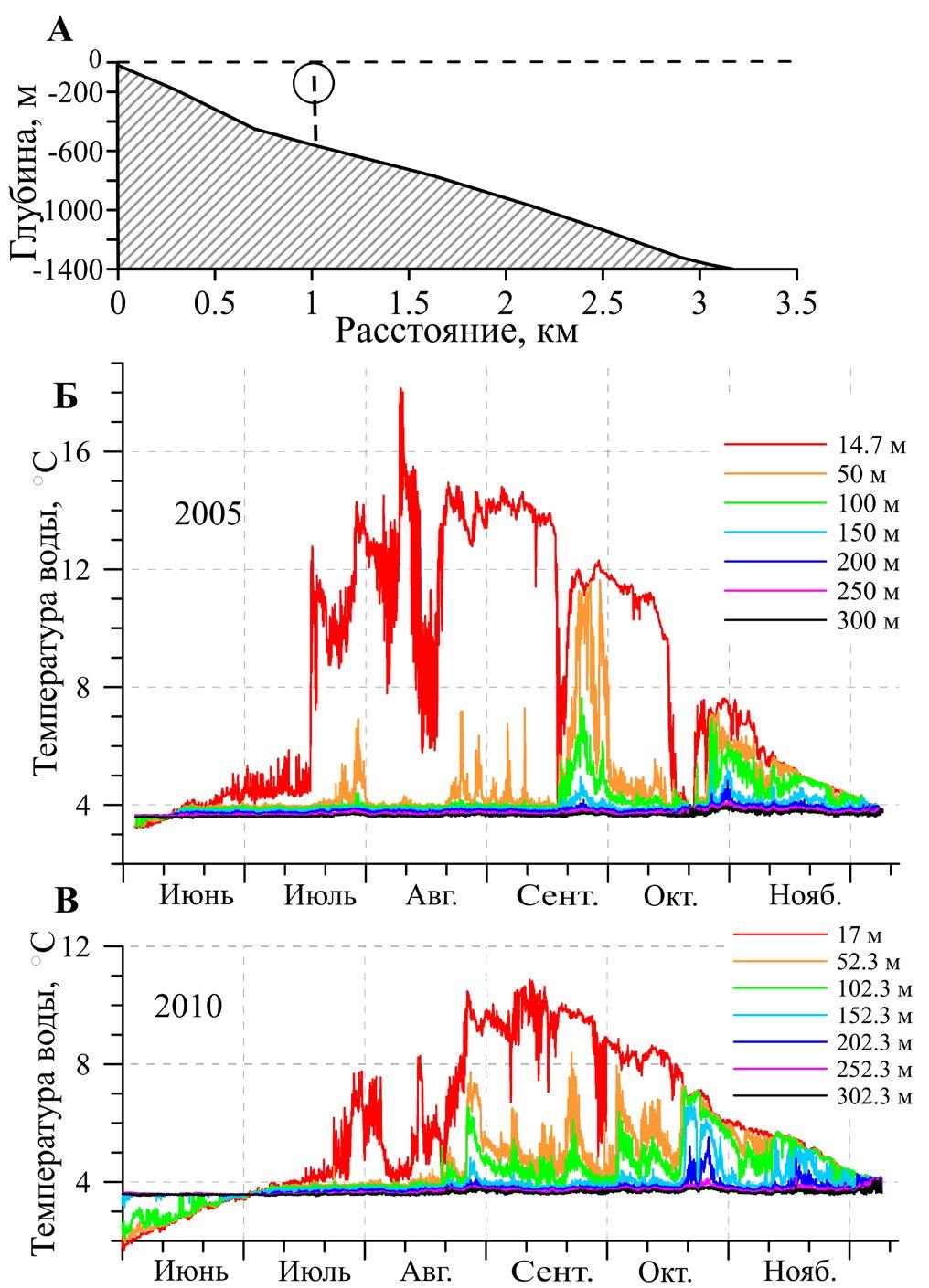 Публикации о вертикальном распределении годовых максимальных температур в димиктических озерах, в частности в глубоководных районах озера Байкал, отсутствуют. Межгодовая изменчивость температуры и глубины залегания мезотермического максимума температуры в подледный период обсуждается в статье Aslamov et al. (2024). О распределении максимальных температур воды в прибрежной зоне Байкала на глубинах дна 15 м и менее существует только две работы (Россолимо, 1957; Fedotov and Khanaev, 2023). Поэтому целью настоящего исследования было впервые представить данные о годовых максимумах температуры воды с помощью стационарных многолетних высокоточных измерений температуры на разных горизонтах (с 2005 по 2016 г., кроме 2009 г.), относящихся к глубинам дна до 550 м в южной прибрежной зоне Байкала. После анализа массивов данных вертикальных профилей температуры была установлена эмпирическая зависимость между абсолютным годовым максимумом температуры и датой и глубиной его появления .