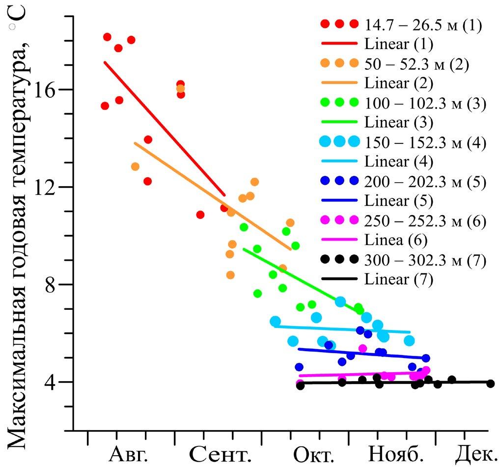 Семь наборов данных для каждого исследуемого горизонта за одиннадцать лет позволяют проиллюстрировать, как изменялась годовая максимальная температура воды в зависимости от дня года с линейной зависимостью для каждого горизонта (Рис. 2).