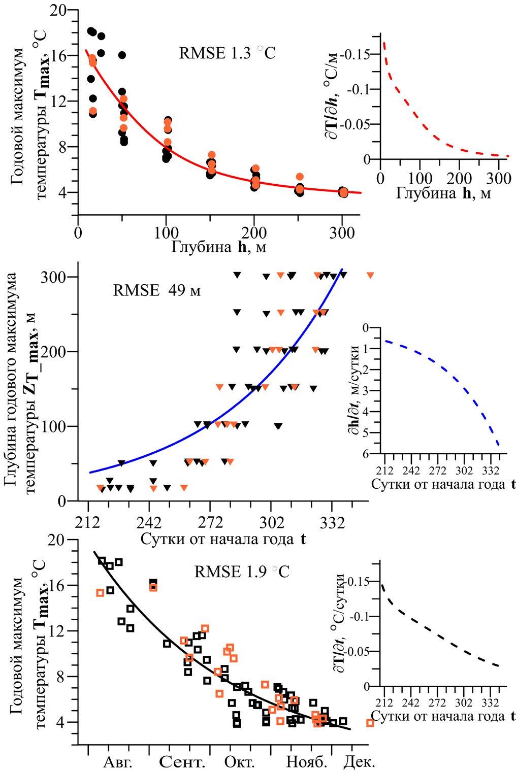 Дифференцирование полученных зависимостей позволяет оценить скорости изменения изучаемых параметров. В связи с нелинейностью зависимостей для изучаемого периода сезонного охлаждения южной части Байкала наибольшая изменчивость максимальных годовых температур со временем наблюдалась в начале августа сразу после начала регулярного конвективного перемешивания на глубине до 50 м (Рис. 3, правый верхний и нижний графики). В это же время скорость углубления также максимальна.
