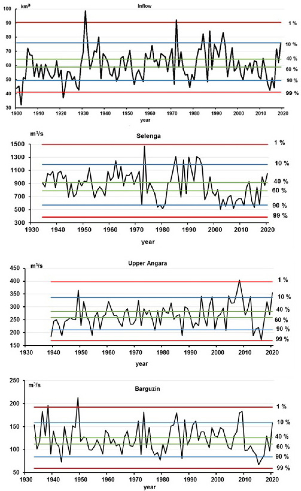 For Lake Baikal, the problems of water availability indicators have been exacerbated since 2001 due to the restrictions of its level regulation limits. It is necessary to introduce normative-legal relations in the sphere of water resources using quantitative criteria of low-water or high-water periods to find a right solution. In this context, Abasov et al. (2017) considered the option of dividing the useful inflow values to Lake Baikal into five water availability gradations. In the work of Bolgov et al. (2018), the boundary values of inflow for water provision below 50% are estimated. Within the assignment of NRM (Natural Resources Ministry) on optimization of the level regime of Lake Baikal, the SHI proposed a scheme for dividing the useful inflow to Lake Baikal into seven water content gradations. Concurrently, it becomes evident that in order to enhance the efficacy of the regulation of lake runoff and its level, to safeguard the Baikal ecosystem, and to minimize the potential socio-economic risks in the region, quantitative water availability indicators should be based not only on inflow, but also on other characteristics of the water regime in the Baikal basin, and be enshrined in legislation. This paper is aimed at examining these factors in relation to the total surface water inflow to Lake Baikal and the runoff of its principal tributaries.
