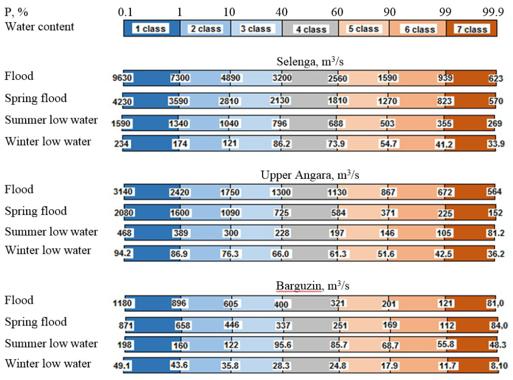 For practical use of the obtained results, it is obviously necessary to study other variants with different boundaries and number of water content gradations, because when considering a specific problem, an individual solution variant, including different period of averaging of initial data, may be optimal. For some watercourses, in this respect, it is expedient to involve in the analysis the characteristics of maximum and minimum runoff, which makes it possible to assess the absolute amplitude of fluctuations in river water discharge and a more objective approach to the choice of one or another variant of water content gradation allocation.