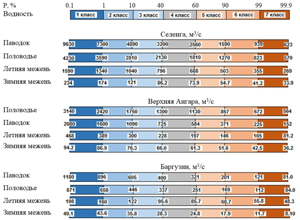 The main parameters of the inflow distribution and its boundary values of calculated provision for each calendar year and individual month (Table 1) allow differentiating river water inflow to Lake Baikal based on the availability of water into seven distinct classes.