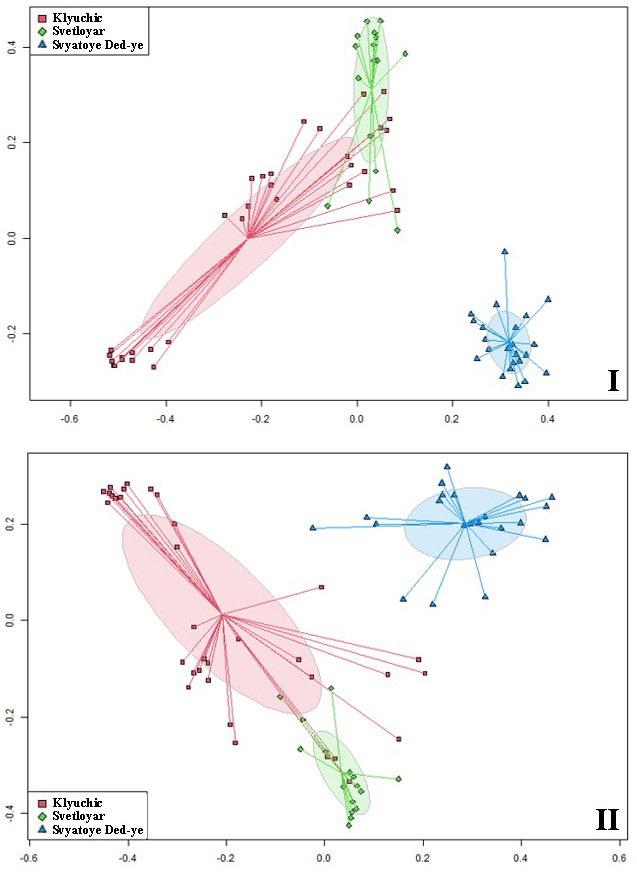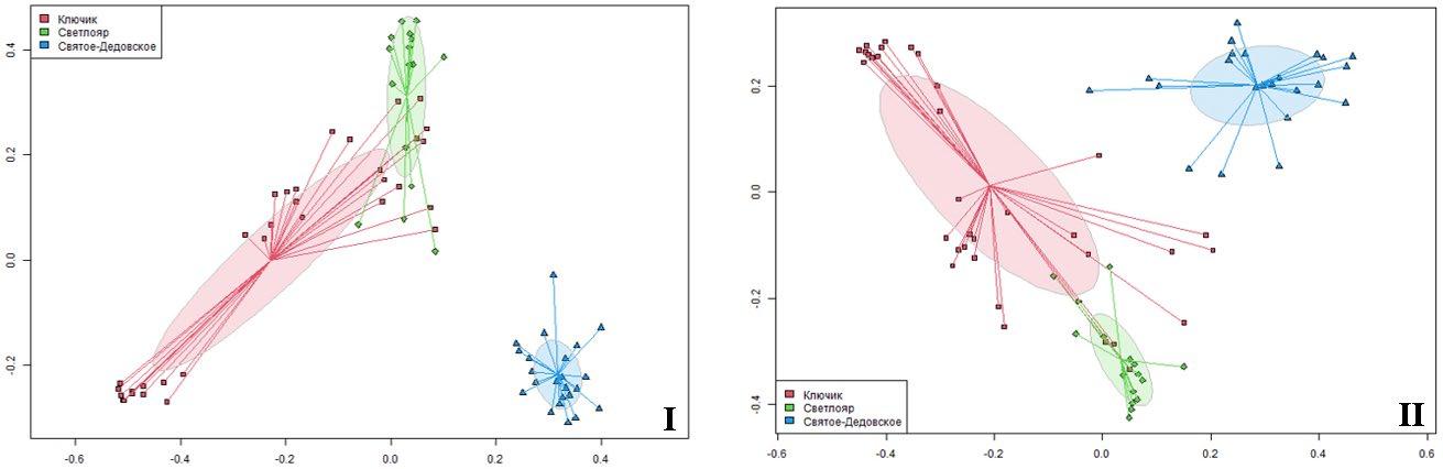 Рис.5. Различия функциональных комплексов по численности (I) и по биомассе (II) фитопланктона исследуемых озер (визуализация по данным многофакторного дисперсионного анализа (Permanova))