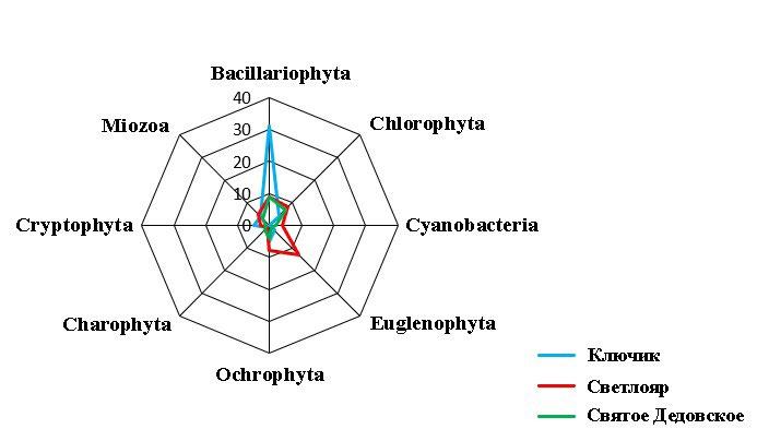 В составе фитопланктона озер Ключик, Светлояр и Святое Дедовское выявлено 432 видовых и внутривидовых таксонов водорослей, принадлежащих 8 отделам. Анализ альгофлоры исследованных озер показал таксономическую значимость отделов Cyanobacteria, Chlorophyta, Bacillariophyta, Ochrophyta и Euglenophyta, составляющих более 70% от общего видового богатства. Состав доминирующих видов насчитывал 114 видов водорослей (26,38% от общего состава): в озере Святое Дедовское преобладали зеленые и диатомовые (50%) водоросли, в озере Светлояр – эвглениды (25%), в озере Ключик – диатомеи (более 40%).