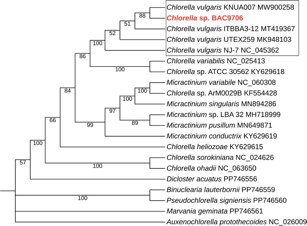 Phylogenetic analysis using the mitochondrial genomes of Chlorellales species indicated that strain BAC9706 is closely related to other C. vulgaris strains - UTEX259, NJ-7, ITBBA3-12, KNUA007 and they clustered in the Chlorella lineage with 100% bootstrap support (Fig. 2).