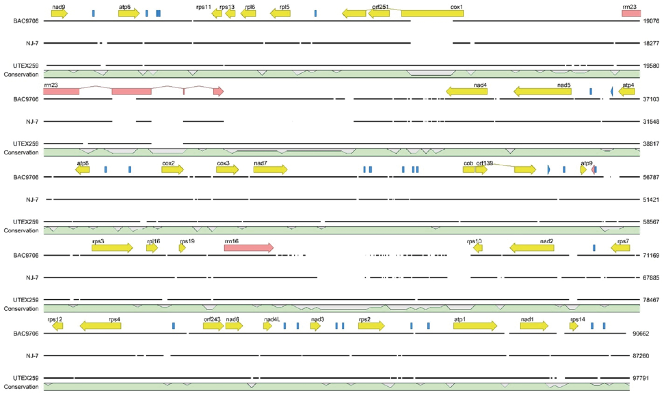 The protein-coding genes include 13 for ribosomal proteins (rpl5-6, 16, rps2-4, 7, 10-14, 19), 9 for NAD(P)H-quinone oxidoreductases (nad1–7, 9 and nad4L), 5 for ATP synthases (atp1, atp4, atp6, atp8 and atp9), 3 for coxs (cox1–3), 1 for cob, and 3 orf for putative proteins. Transfer RNA genes for all 20 amino acids were identified, in which tRNA-Met, tRNA-Leu are triplicated, and tRNA-Ser, tRNA-Arg, and tRNA-Gly are duplicated.