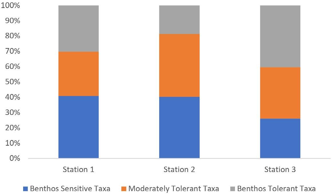 Overall, benthos sensitive taxa made up 35.7% of the total community across all stations, moderately tolerant taxa accounted for 34.9%, and benthos tolerant taxa comprised 29.0%. (Table 3). These variations in community structure reflect differing levels of environmental pressure across the stations, with Station 1 showing better water quality, Station 2 reflecting moderate environmental conditions, and Station 3 indicating higher levels of disturbance.