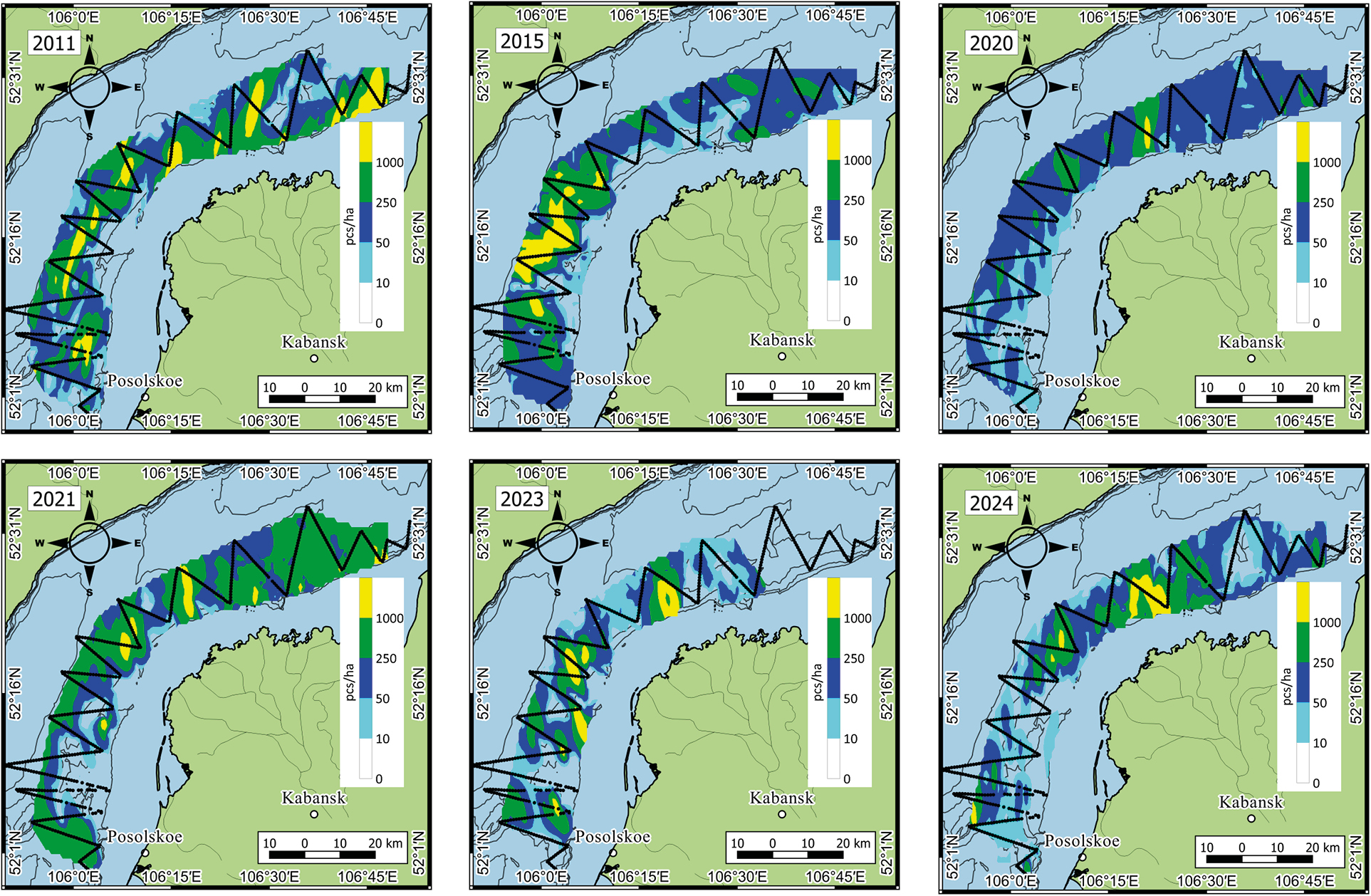 The distribution characteristics of Baikal omul from 2011 to 2024 are shown in Fig. 1. In 2011, when Baikal omul stocks were assessed as satisfactory, accumulations of >1000 pcs ha-1 were recorded throughout the entire study area of the Selenga shallows, and in 2015, they were detected only in the southeastern part. In 2020, we recorded virtually no fish accumulations. As a rule, their concentrations were <250 pcs ha-1, which is below average. In 2022, we recorded the concentrations of average density throughout the entire water area of the Selenga shallows. In 2023, there were large accumulations of Baikal omul in southwestern and central parts of the area, but they were relatively uneven and more dynamic (Anoshko et al., 2023). We observed their redistribution from south to north, probably due to the specific heating of the coastal-bay zone as well as to the influx of warmer waters of the Selenga River. In 2024, we recorded omul throughout the entire area of the shallows, and dense accumulations in its central part (Fig. 1).