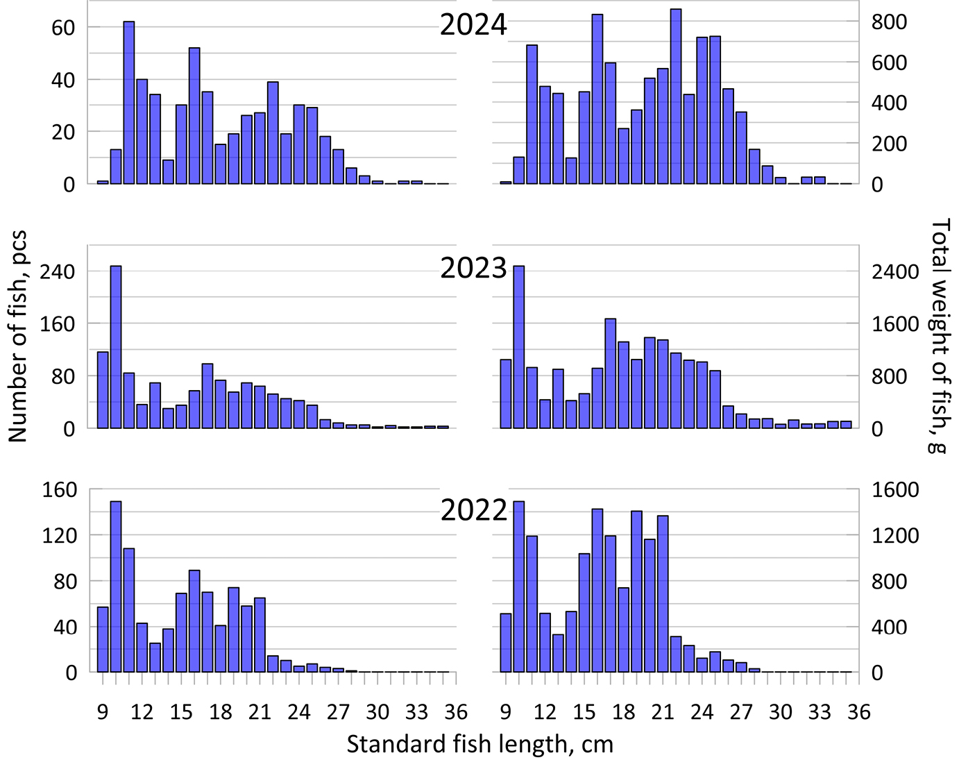 Based on trawl catches in different parts of the Selenga shallows, SL of fish from the feeding stock ranged from 9 to 35 cm between 2022 and 2024. Representative samples (Fig. 3) had a characteristic distribution of individuals by size with modes corresponding to age classes.