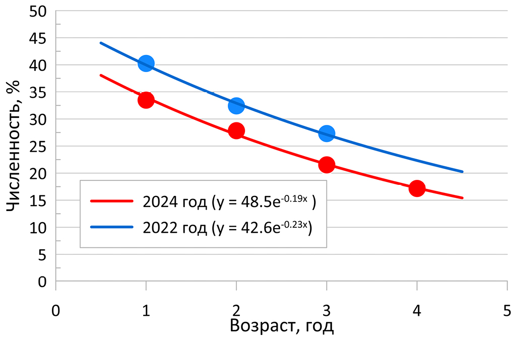 The data for 2022 and 2024 allowed us to estimate the natural mortality level (Fig. 4) because commercial fishing of omul was banned, and the mortality of fish of this size due to recreational and poaching fishing can be excluded. The instantaneous rate of natural mortality of individuals aged one to three years in 2022, based on power exponential function, was 0.19, and those aged from one to four years in 2024 – 0.23. These results comply with the rates calculated for the corresponding ages of Coregonus muksun (Pallas, 1814) (Matkovskiy, 2023) having a long lifespan, like Baikal omul.