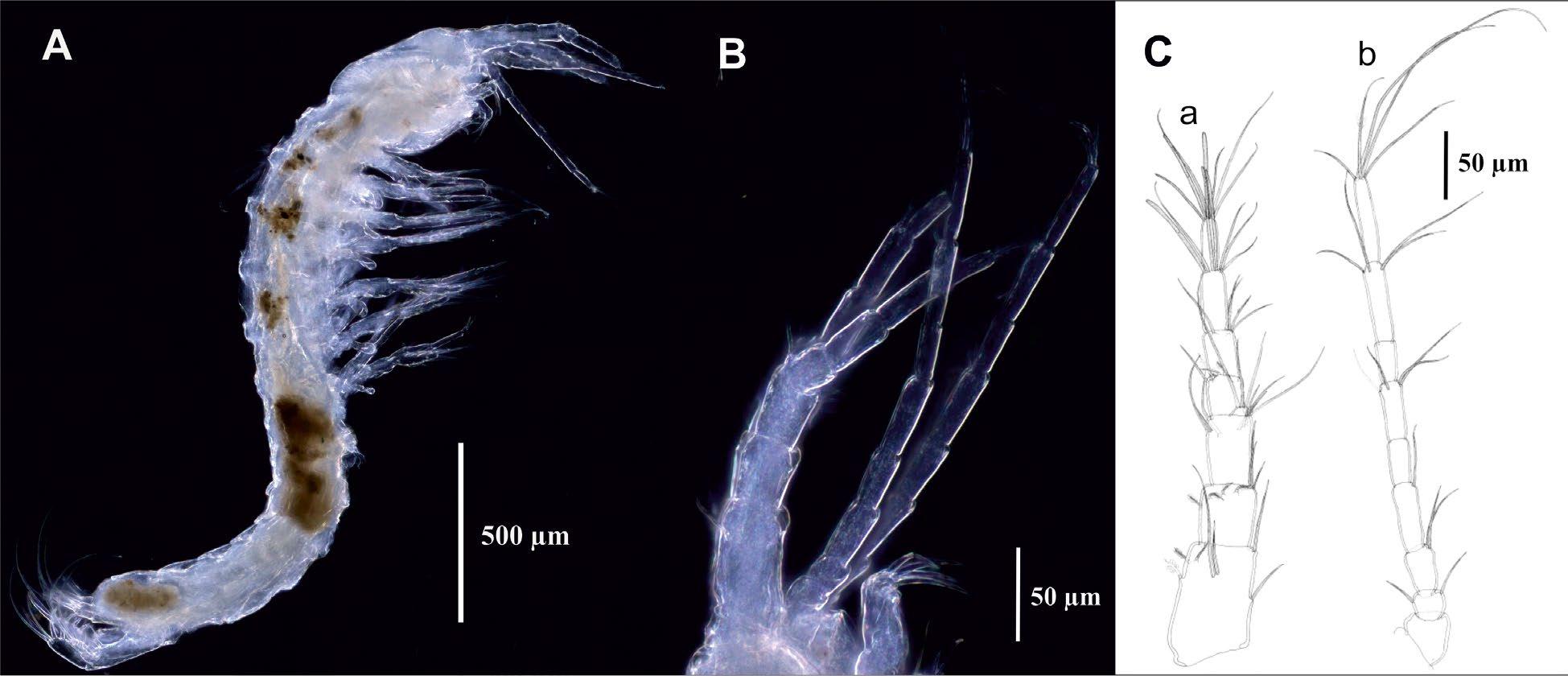 Fig.1. А – photo of Baicalobathynella cf. magna (Bazikalova, 1954); B – photo of antennae of B. cf. magna (A and B – photo by Enushchenko I.V.); С – drawing of antennae (a – antennula, b – antenna), adapted from Drewes and Schminke (2011).