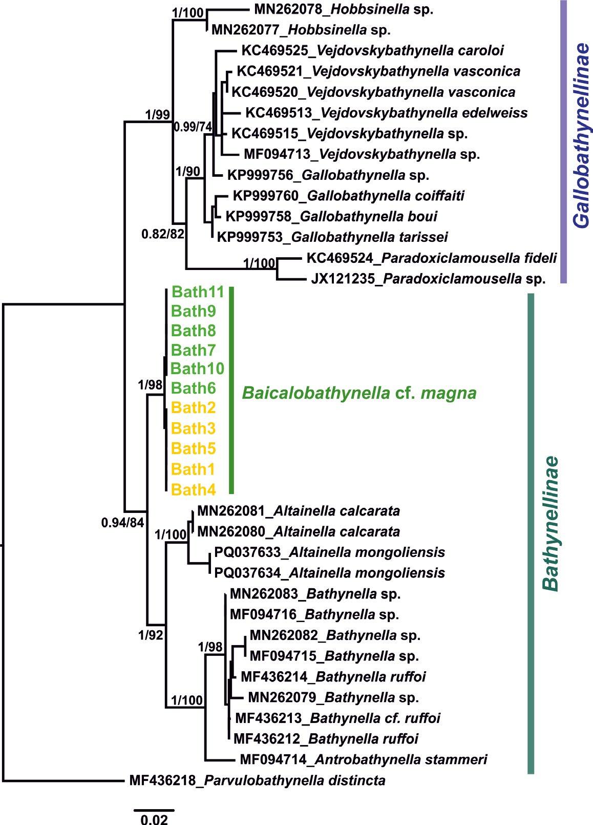 The phylogenetic tree based on 18S rRNA, with statistical supports for branch topology, is illustrated in Figure 3. Small clade supports within larger clusters are omitted for clarity. On the phylogenetic tree, Baikal bathynellids form a distinct clade within the subfamily Bathynellinae, clustering as a sister group to the European representatives of Bathynella Vejdovsky, 1882, and Altainella Camacho, 2020, from Altai and Mongolia.