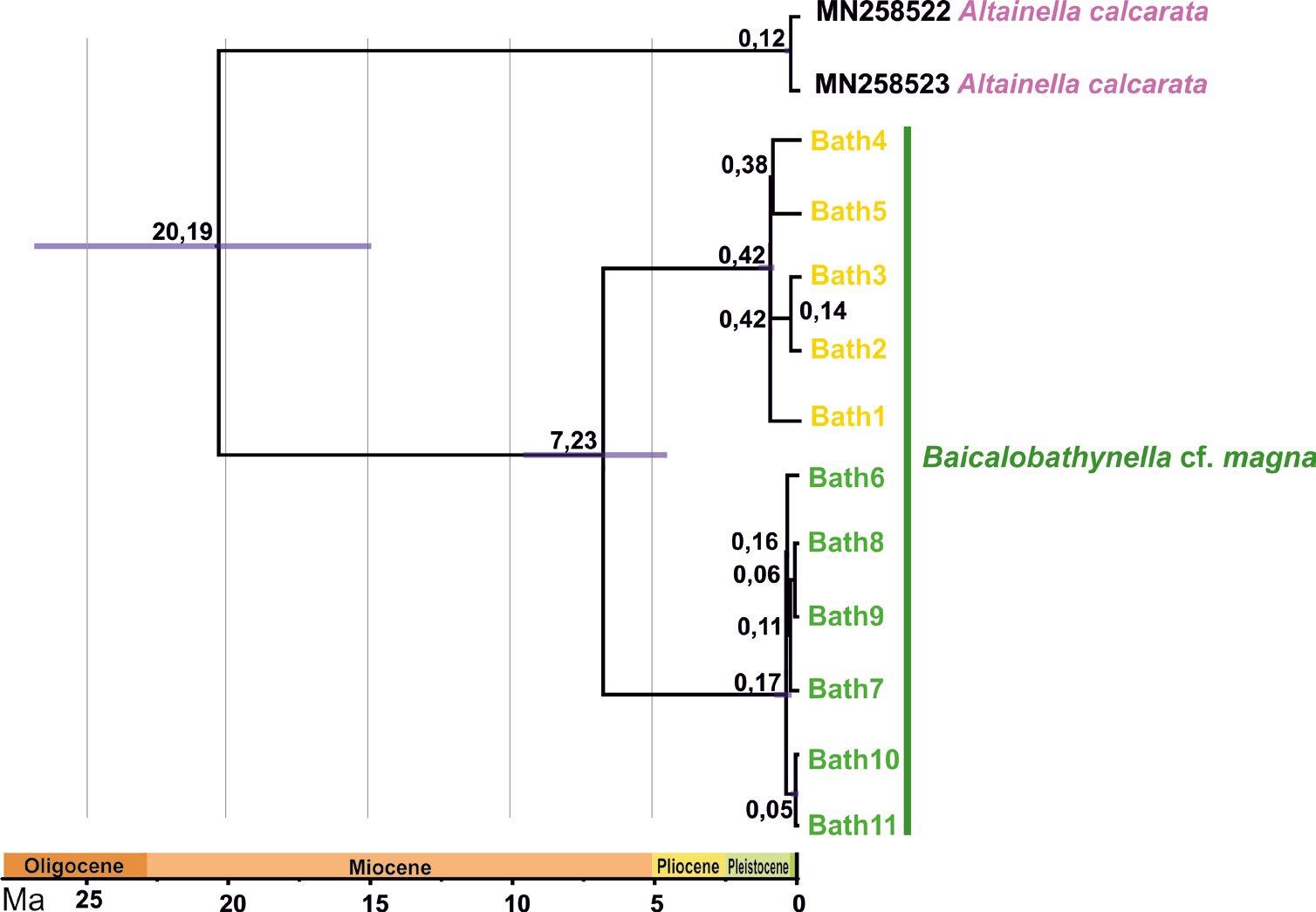 The genus Baicalobathynella originated in the late Oligocene–early Miocene (around 20.2 Ma), while the divergence time estimated for the two genetic lineages of B. cf. magna falls on the late Miocene–early Pliocene (on average 7.2 Ma) (Fig. 4).