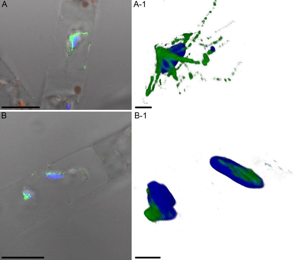 3. Рис.2. Визуализация α-тубулина на ранней стадии формирования створки и в интерфазе на оптических срезах (А, Б) и трехмерных реконструкциях (А-1, Б-1) в клетках A. islandica (ЛСМ). Зеленый – флуоресценция Alexa-488 после окрашивания α-тубулина, синий – флуоресценция DAPI, красный – автофлуоресценция хлорофилла. Масштаб: А, Б – 10 мкм; А-1, Б-1 – 2 мкм.